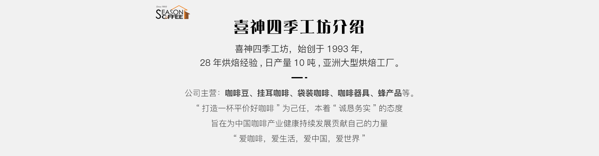 喜神杭州食品有限公司,始于1993年,是一家中國大型的咖啡豆烘焙商,年咖啡豆設計吞度量可達近萬噸,公司產品以咖啡豆烘焙,咖啡粉,濾掛咖啡和袋泡咖啡為主。坐落在浙江杭州濱江區,毗鄰阿里巴巴濱江園區,旨在通過結合電子商務加大喜神咖啡的市場規模。 公司咖啡豆來自世界主要產區,包括南美洲,北美洲,亞洲和非洲等等產區。 公司在2017年引進全新意大利大型烘焙設備,經過1年多的裝修調試,于2018年建成國內專業大型的烘焙設備,引進360公斤級烘焙設備等等。 喜神咖啡致力于打造“一杯平價好咖啡”,通過專業的技術和設備以及從業30年的經驗,對咖啡樹種植,咖啡豆采摘和處理以及運輸等等進行全方位監控和跟蹤,達到對咖啡生豆的深入全面熟悉。 喜神咖啡通過了ISO22000,HACCP,雨林認證,清正認證等等,喜神有專業冠軍咖啡師堅持杯測,研發新品是喜神咖啡創新的基礎。 喜神咖啡愿和廣大的伙伴一道促進咖啡發展