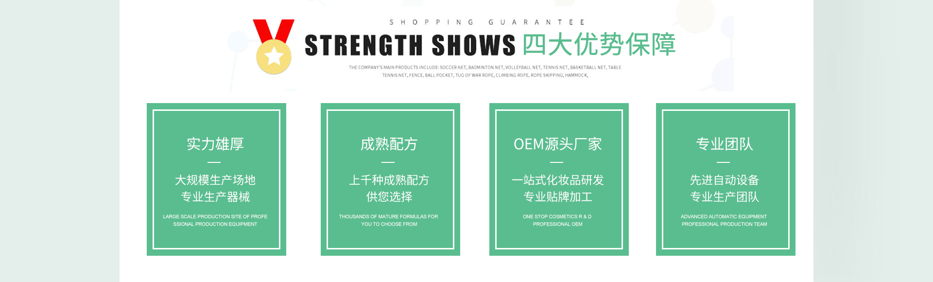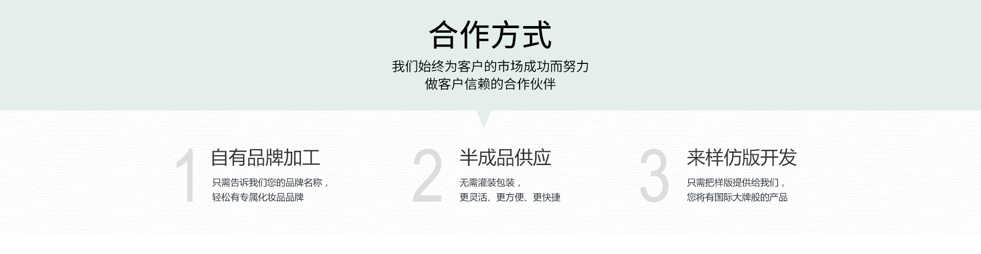 本公司是一家專(zhuān)業(yè)的護(hù)膚品OEM/ODM貼牌代工廠(chǎng)家,擁有GMP車(chē)間凈化10萬(wàn)級(jí),全封閉生產(chǎn)車(chē)間配以高級(jí)空氣凈化系統(tǒng)及消毒系統(tǒng),灌裝設(shè)備應(yīng)用氣動(dòng)裝置,無(wú)接觸無(wú)菌操作。多條生產(chǎn)線(xiàn)滿(mǎn)足不同需求量的生產(chǎn),擁有高效的產(chǎn)能,可滿(mǎn)足巨大的生產(chǎn)需求,嚴(yán)格按照國(guó)家化妝品生產(chǎn)標(biāo)準(zhǔn)要求設(shè)計(jì)和運(yùn)作,有多名優(yōu)質(zhì)專(zhuān)業(yè)的研發(fā)人員,生產(chǎn)基地和灌裝線(xiàn),不斷的研發(fā)各種新穎、獨(dú)特、安全、高效的功效性產(chǎn)品,根據(jù)市場(chǎng)的各種需求為您量身定做配方,按您的要求進(jìn)行靈活的配方設(shè)計(jì),生產(chǎn)出高水準(zhǔn)的個(gè)性化產(chǎn)品,為您靈活運(yùn)作市場(chǎng)提供有力的保障。 竭誠(chéng)歡迎廣大新、老客戶(hù)來(lái)電洽談合作!
