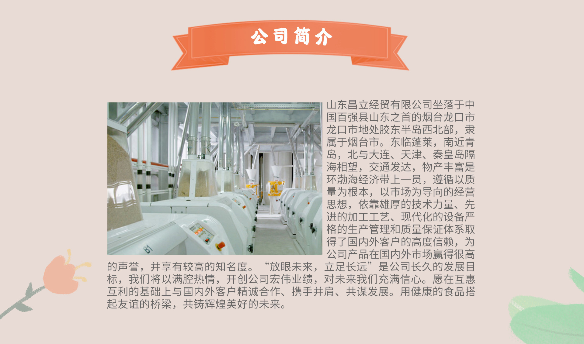山東昌立經貿有限公司坐落于中國山東煙臺市,煙臺市地處膠東半島西北部,南近青島,北與大連、天津、秦皇島隔海相望,交通發達,物產豐富,是環渤海經濟帶上一顆璀璨的明珠。 山東昌立經貿有限公司創立于2011年,是一家集研發、加工、倉儲、種植與營銷于一體的生物科技民營企業,公司奉行“信譽第一,客戶至上,互惠互利,利益共享”的經營理念,以“做一流產品,創一流業績“為核心價值觀,精心打造優質的產品和良好的信譽,通過引進先進的生產加工設備和高技術專業人員,遵循以質量為根本,以市場為導向的經營思想,依靠雄厚的技術力量、先進的加工工藝、現代化的設備、嚴格的生產管理和質量保證體系,取得了國內外客戶的高度信賴,為公司產品在國內外市場贏得很高的聲譽,并享有較高的知名度。“放眼未來,立足長遠”是公司長久的發展目標,我們將以滿腔熱情,開創公司宏偉業績!