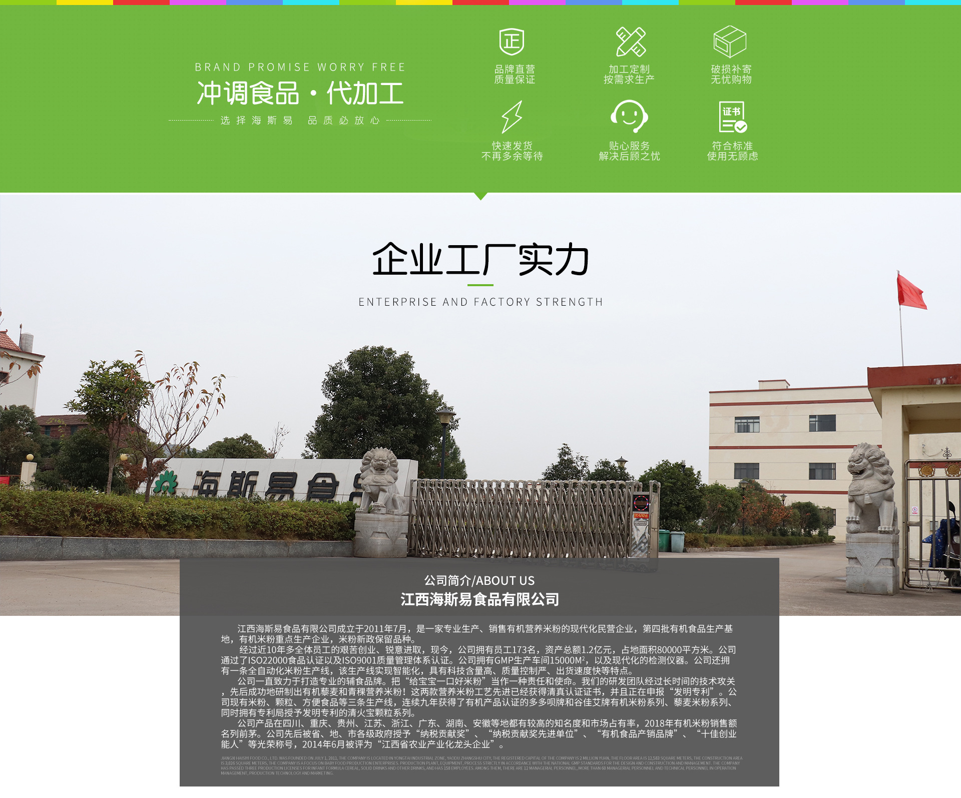 海斯易食品是一家專業生產、銷售有機營養米粉的現代化民營企業。國家第四批有機食品生產基地,中國有機米粉重點生產企業、國家米粉新政保留品種。公司發展為今天現有員工173名,資產總額1.2億元,占地面積80000m2。公司通過了ISO22000食品安全管理體系認證以及ISO9001質量管理體系認證。公司擁有GMP生產車間15000m2,并且建有一流的生產廠房,以及現代化的檢測儀器。公司還擁有國內第一條也是目前唯一一條全自動化米粉生產線,該生產線完全實現智能化,具有科技含量高、質量控制嚴、出貨速度快等特點。公司現有嬰幼兒米粉、顆粒、方便食品三條生產線,連續九年獲得了國家有機產品認證的多多唄牌和谷佳艾牌有機米粉系列、藜麥米粉系列、同時獲得國家專利局授予發明專利的清火寶顆粒系列。公司先后被省、地、市各級政府授予“納稅貢獻獎”、“中國有機食品產銷品牌”、2018年6月被評為“江西省農業產業化龍頭企業”。