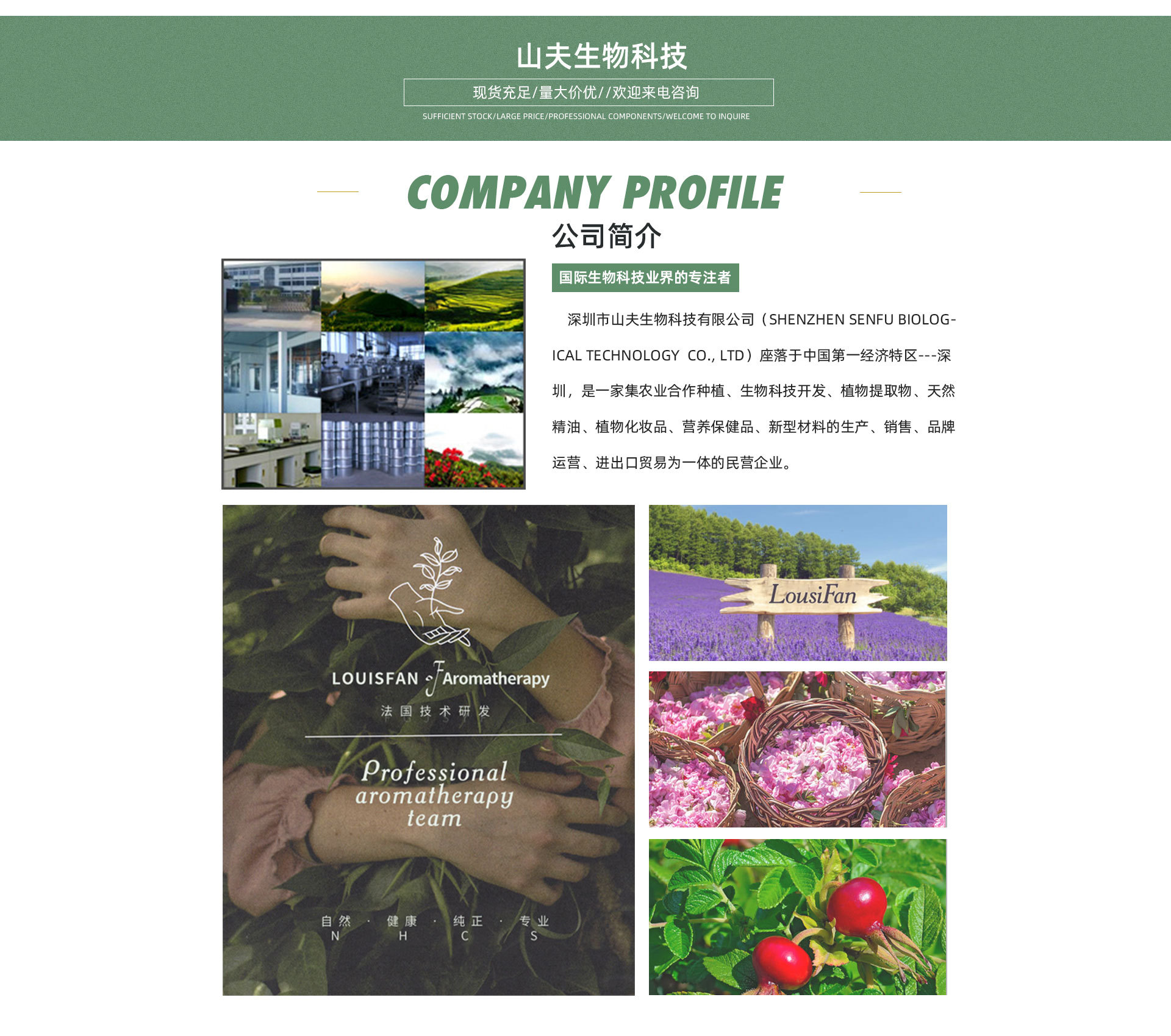 LOUSFAN路易詩凡集團-深圳市山夫生物科技,是一家集生物科技開發、天然原料、香氛香料、芳療配方輸出、品牌運營、進出口貿易為一體的具有15年從業經驗的生物科技公司 LOUISFAN集團創立之初與世界優勢產區緊密合作,在保加利亞、摩洛哥,中國香港均設有研發中心及集采中心,創立之初全面引進的先進生物提取系統、醫藥化妝品技術、香氛香料研發、檢測儀器及管理理念,積極推行ISO9001、ISO 14001、OHSAS 18001國際管理體系標準。秉承以顧客關注為焦點;堅持以專注的態度做好時尚天然芳療香氛品牌的創新引領者,元素多樣化,產品風格多元化;LOUSFAN倡導“天然與健康結合、科技與創新結合”的精神理念,專為崇尚健康、熱愛生活、追求真實、富有品味的消費者而研發。旨在以更為優良的品質,更為合理的價格,高端的品牌價值全面賦予合作伙伴篤定的選擇和自由化搭配。