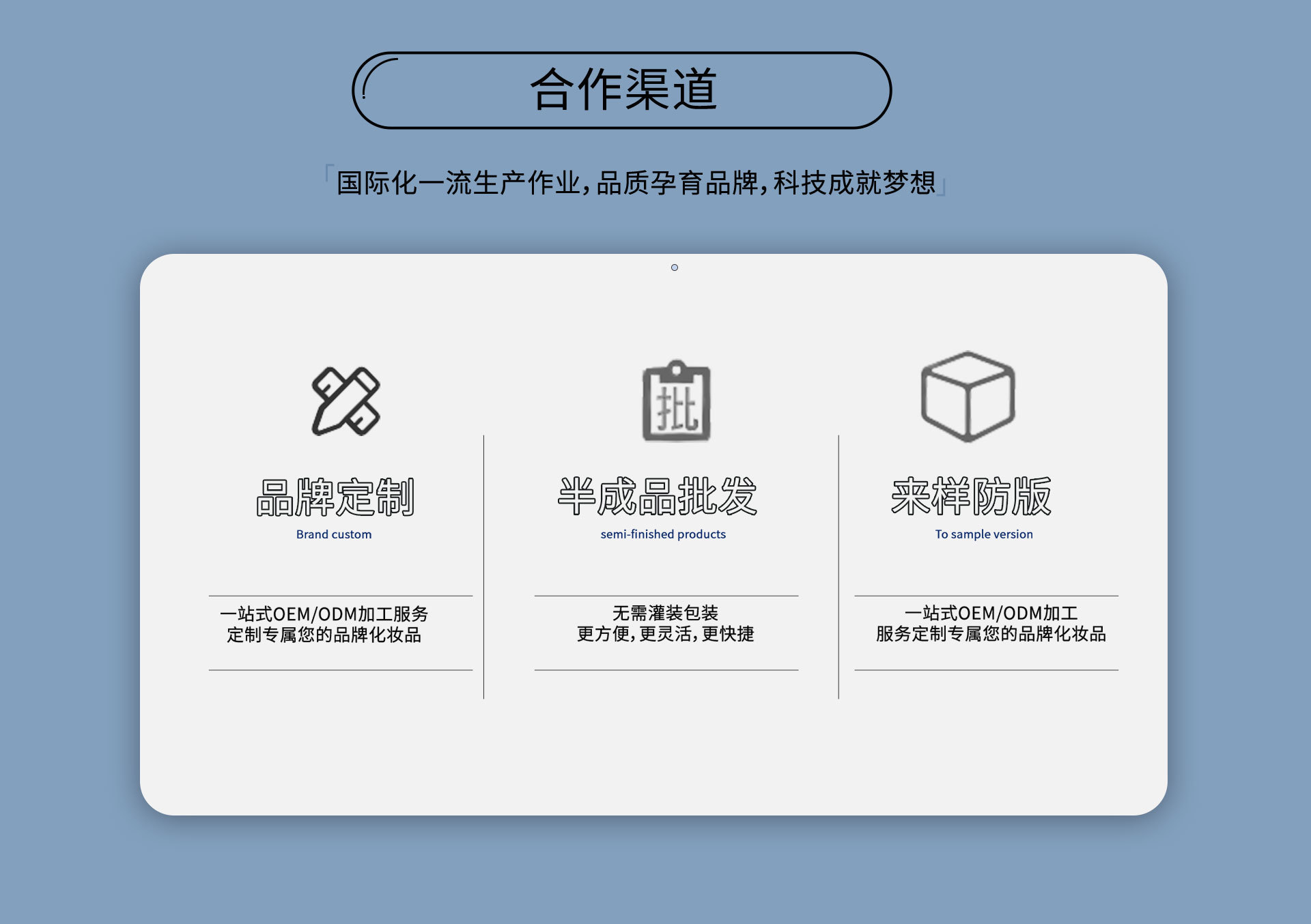 廣州軒顏化妝品有限公司是一家集研發(fā)、生產(chǎn)、銷售一體的OEM/ODM代加工一站式優(yōu)質(zhì)服務(wù)的化妝品企業(yè),配備10萬(wàn)級(jí)凈化車間和自動(dòng)化流水作業(yè)線,先進(jìn)的制造設(shè)備和檢測(cè)儀器,具備生產(chǎn)國(guó)際一流化妝品的能力。嚴(yán)格執(zhí)行ISO9001-2000國(guó)際質(zhì)量管理體系,以確保產(chǎn)品品質(zhì)達(dá)到歐盟水準(zhǔn)。上市產(chǎn)品均通過(guò)國(guó)家衛(wèi)生、食品藥品監(jiān)督管理局等權(quán)威部門的安全查驗(yàn),證實(shí)了產(chǎn)品堅(jiān)實(shí)的品質(zhì),內(nèi)重品質(zhì),外重誠(chéng)信! 海納百川而成其大,天地之廣誰(shuí)與媲美。軒顏將以真誠(chéng)的服務(wù)與無(wú)與倫比的產(chǎn)品品質(zhì),傲立在商潮的浪尖! 企業(yè)宗旨:誠(chéng)信立本 以人為本 企業(yè)精神:敬職敬業(yè) 精益求精 團(tuán)隊(duì)合作 勇于創(chuàng)新 經(jīng)營(yíng)理念:專注,創(chuàng)造無(wú)限價(jià)值! 服務(wù)宗旨:誠(chéng)信 熱情 專業(yè) 品質(zhì) 全方位實(shí)現(xiàn)讓美麗更簡(jiǎn)單,讓您“更安全,更放心”。