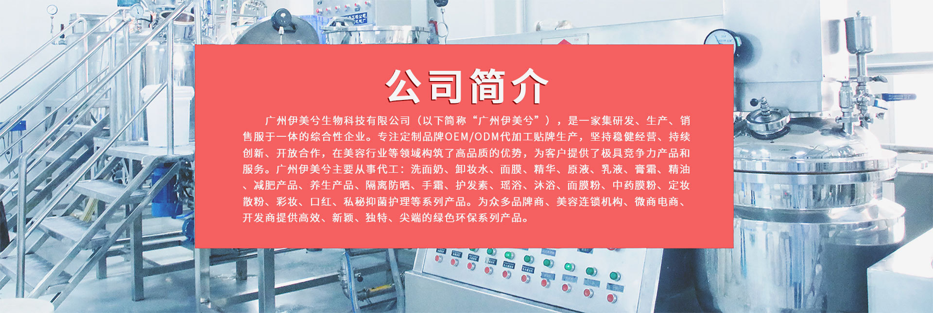 廣州伊美兮生物科技有限公司(以下簡稱“伊美兮”) 創立于2016年3月 是一家集研發、生產、服于一體的綜合性企業一站式服務 專注定制品牌OEM/ODM代加工,貼牌生產 堅持穩健經營、持續創新、開放合作,在美容行業等領域構筑了高品質的優勢,為客戶提供了極具競爭力產品和服務。并致力于讓美麗無處不在,讓健康無所不及。所有的人類因美容健康的行業而變的完美自信。 主要從事代工/貼牌:妝字號,妝安號特證產品、消字號、械字號、膜粉等 洗面奶、卸妝水、面膜、精華、原液、乳液、膏霜、精油、美白淡斑產品、減肥產品、養生產品、隔離防曬、手霜、護發素、瑤浴、沐浴、面膜粉、中藥膜粉、定妝散粉、彩妝、口紅、私秘抑菌護理等系列產品。為眾多品牌商、美容連鎖機構、微商電商、直播,開發商提供高效、新穎、獨特、尖端的綠色環保系列產品。專注定制品牌OEM/ODM代加工/貼牌生產。 期待您的洽談合作.