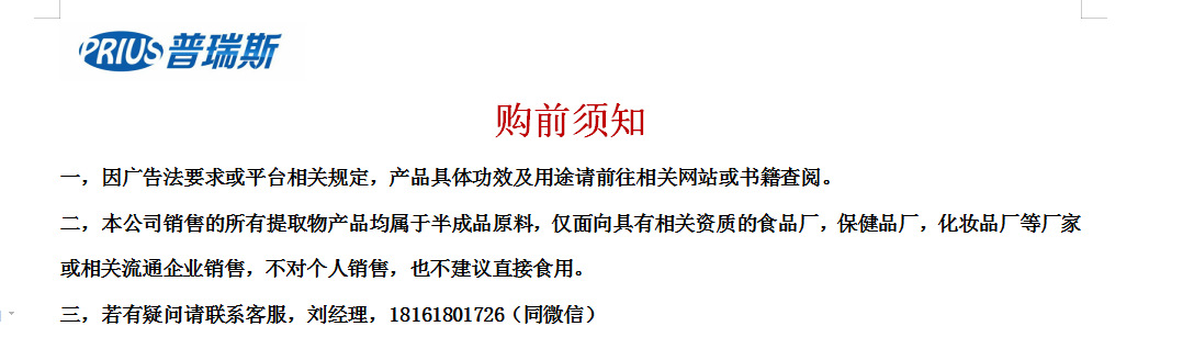 西安普瑞斯生物工程有限公司(原漢中昊天植提工廠)位于西安市國家級高新技術產業開發區,是一家致力于天然動植物提取物,醫藥中間體的研究、開發、生產與銷售為一體的高新技術企業。公司本著誠信,健康,合作,共贏的理念。致力于人類的健康服務。 普瑞斯生物于2005年1月新建設投資GMP標準廠房8000平米,嚴格按照國家藥典生產流程指標控制審核,QS, ISO, HACCP, GMP等質量管理體系來嚴格要求自己,嚴把質量關,持續為國內外客戶提供一流的產品和優質的服務,普瑞斯生物配備有亞臨界萃取及超臨界萃取等世界一流的加工設備;公司嚴格按照ISO9001:2000質量管理體系把控從進料-加工-檢驗-包裝-出廠-銷售等每個環節;以快速的新產品開發、穩定的產品質量和高科技持續穩定的技術支持贏得了全球客戶的認可,使公司產品遠銷美國,歐洲,日本等地。我們熱烈歡迎各界朋友蒞臨參觀、指導和業務洽談,同時也真誠的希望和