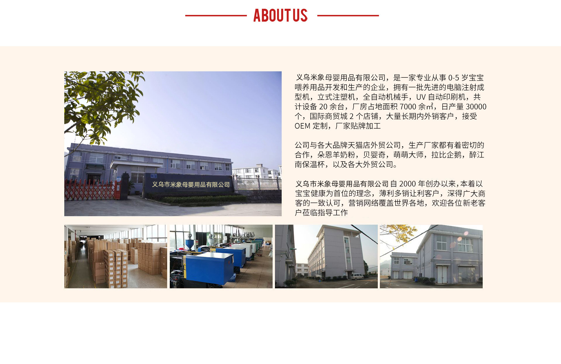 義烏米象母嬰用品有限公司是奶瓶、奶嘴、水杯、食用工具制造、嬰兒奶瓶等產品專業生產加工的公司,擁有完整、科學的質量管理體系。義烏米象母嬰用品有限公司的誠信、實力和產品質量獲得業界的認可。歡迎各界朋友蒞臨參觀、指導和業務洽談。