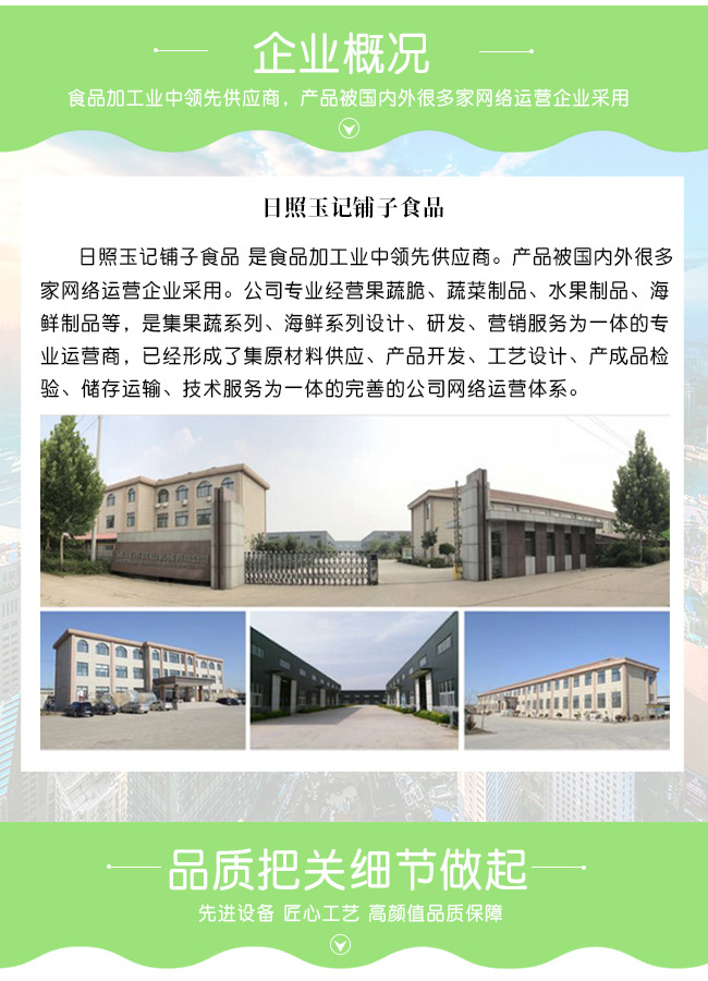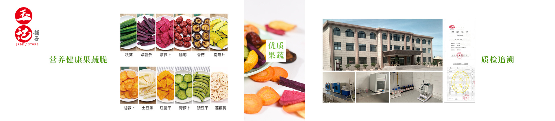 日照玉記鋪?zhàn)邮称酚邢薰緦I(yè)從事VF(真空低溫脫水)食品加工產(chǎn)業(yè),自有100多畝大型工業(yè)園區(qū),擁有先進(jìn)的VF設(shè)備生產(chǎn)線,在原有果蔬脆系列產(chǎn)品基礎(chǔ)上,研發(fā)出系列化的菌菇脆、海鮮脆等眾多新品種,積極倡導(dǎo)加工健康食品。 果蔬脆系列:精選新鮮蔬菜和水果,利用精湛的VF(真空低溫脫水)技術(shù),鎖住蔬菜、水果本味及營養(yǎng),留住一日天然所需,VF技術(shù)可保持原蔬果95%以上的營養(yǎng)成分,營養(yǎng)流失甚少,不論視覺還是口感和味道上,都非常優(yōu)秀。果蔬脆片產(chǎn)品嚴(yán)格區(qū)別于薯片等油炸膨化食品,生產(chǎn)工藝流程無膨化過程,不添加人工色素,做出的果蔬脆帶著天然清新的果蔬原味,夾著酥脆的口感,是天然、營養(yǎng)、健康的即食果蔬。 海鮮脆系列:公司全新一代VF海鮮脆產(chǎn)品,原料挑選自深海鮮活海產(chǎn)品,VF海鮮脆產(chǎn)品嚴(yán)格區(qū)別于傳統(tǒng)的海鮮干制品,生產(chǎn)過程不需要膨化、高溫油炸、無高溫烘烤等,不添加人工色素、含鹽量低,易咀嚼好消化