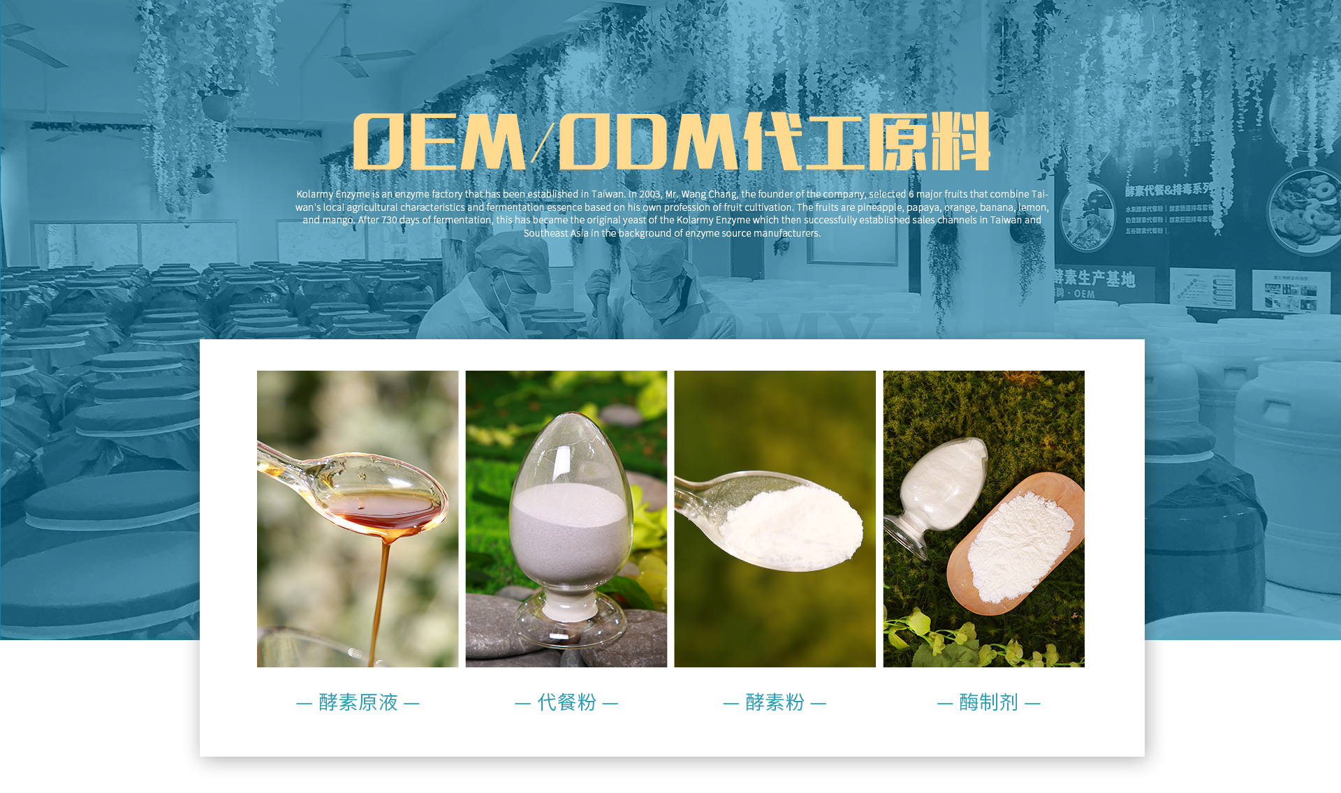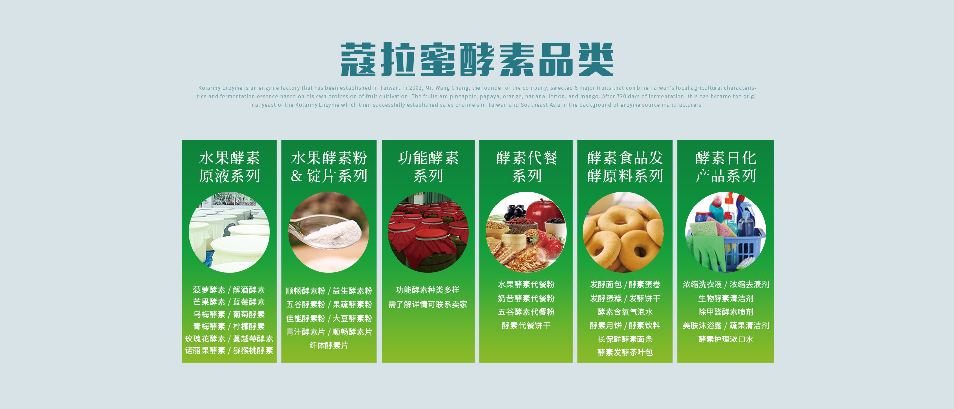 廈門蔻拉蜜生物科技有限公司是酵素原液、酵素粉、酵素、酵素固體飲料等產品專業生產加工的公司。 在臺灣及內地皆有設廠的酵素生產廠家,專注酵素研發20年。蔻拉蜜嚴格執行 ISO9001:2000國際質量管理體系認證及SC中國國家食品質量安全生產許可標準。 蔻拉蜜酵素在蔬果植物酦酵領域的專利,研究,產官學研合作案,制程專業化上早已領先同業,是華人酵素的研發廠家。蔻拉蜜酵素本著「以天下人健康為己任,以自然回歸健康為宗旨」的初衷踏實經營,秉持誠懇的態度持續深耕,堅持采用天然的蔬果植物做為原料,扎實地投入產品創新研究及工廠的專業制程,堅持「自行研發,一貫生產」。