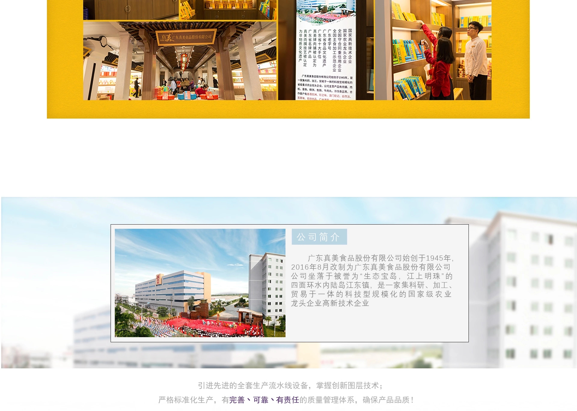 廣東真美食品股份有限公司是肉脯、肉松、肉干、糕點(diǎn)餅食、冷凍食品等產(chǎn)品專業(yè)生產(chǎn)加工的公司,公司擁有國際領(lǐng)先水準(zhǔn)的開發(fā)、檢驗(yàn)及生產(chǎn)儀器設(shè)備,采用國際上先進(jìn)的質(zhì)量檢測手段及質(zhì)量保證體系,建立完善的質(zhì)量保證體系,確保所有產(chǎn)品品質(zhì)安全符合國際標(biāo)準(zhǔn)和要求。先后通過ISO9001、ISO14001、OHSAS18001、ISO22000 及HACCP 國際管理體系認(rèn)證、QS 認(rèn)證及出口食品生產(chǎn)企業(yè)衛(wèi)生注冊證書等。目前公司擁有核心技術(shù)授權(quán)發(fā)明專利21項(xiàng),先后主導(dǎo)及參與《肉脯》、《肉干》、《肉松》、《肉制品分類》、《糖果分類》、《真空軟包裝鹵肉制品》等二十多項(xiàng)國家及行業(yè)標(biāo)準(zhǔn)的制訂工作。廣東真美食品股份有限公司的誠信、實(shí)力和產(chǎn)品質(zhì)量獲得業(yè)界的認(rèn)可。歡迎各界朋友蒞臨參觀、指導(dǎo)和業(yè)務(wù)洽談。