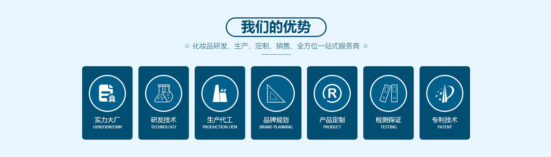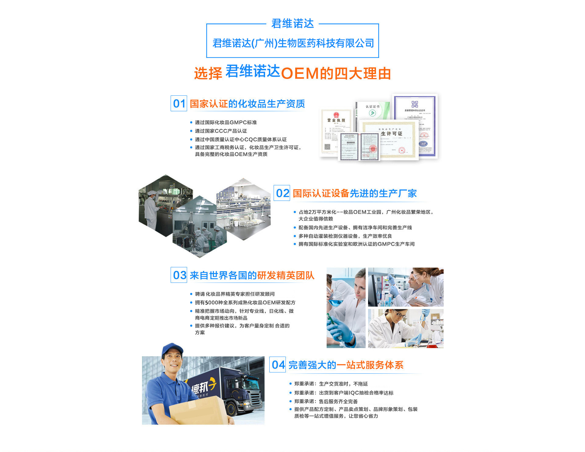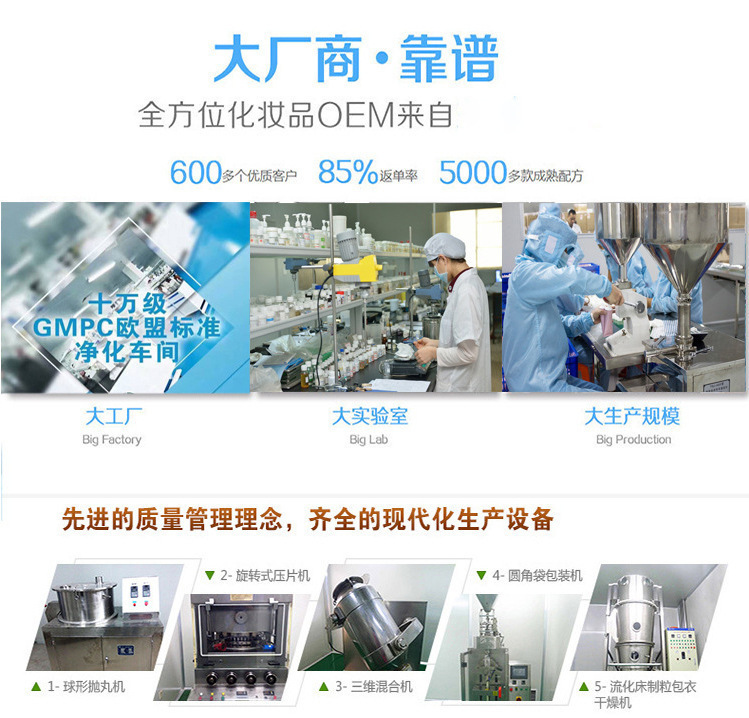 君維諾達是一家集研發、生產、銷售為一體的現代化綜合型企業,涉及品牌推廣與營銷、OEM、ODM等多個領域,具有深厚的行業背景和良好的企業文化。旗下擁有國內一流的生產設備、研發檢測設備。廠房車間全部按照GMP標準建設。擁有全自動流水生產線18條,日生產能力美容套盒2萬套,軟管3萬支,玻璃瓶8萬支,安瓶25萬支,無紡布膜貼100萬片。 擁有四種生產許可證——消妝械粉;可加工生產:1.生殖美療系列:婦科凝膠,私密摩絲,圣潔丹等液體、粉體、膏體多劑型產品,2,養生系列:精油,泥膜粉膏等多種養生產品 3.中高端護膚品系列,膏,霜,水,乳等產品;公司加工總部位于廣州市增城區,白云區設有辦事處,占地面積約30畝,其中專業技術人員占員工總人數的50%。擁有10萬級凈化的生產車間。在技術上公司投入人力,加大產品的標準化研究,形成了產品核心競爭力,使公司的產品質量保證體系穩固、堅實。