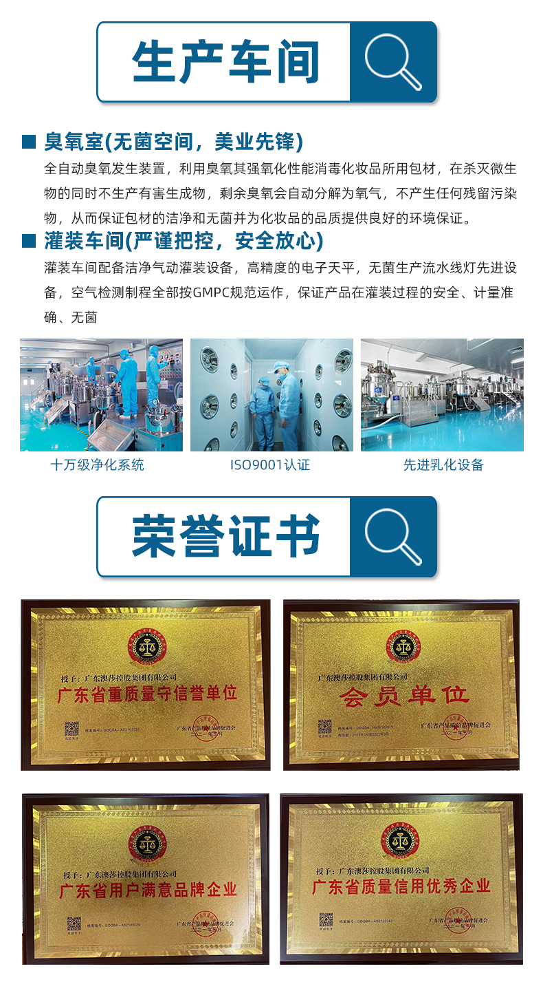 現有世界領先水平的研發體系與生產控制體系,生產廠房嚴格按照GMPC標準設計和建造,擁有全自動化無菌十萬級車間、智能生產控制系統等。澳莎集團生產基地共有30條生產線。標準的生產規范、前沿的生產設備、精準的生產工藝,保證每一瓶產品在安全性和有效性達到行業領先水平。