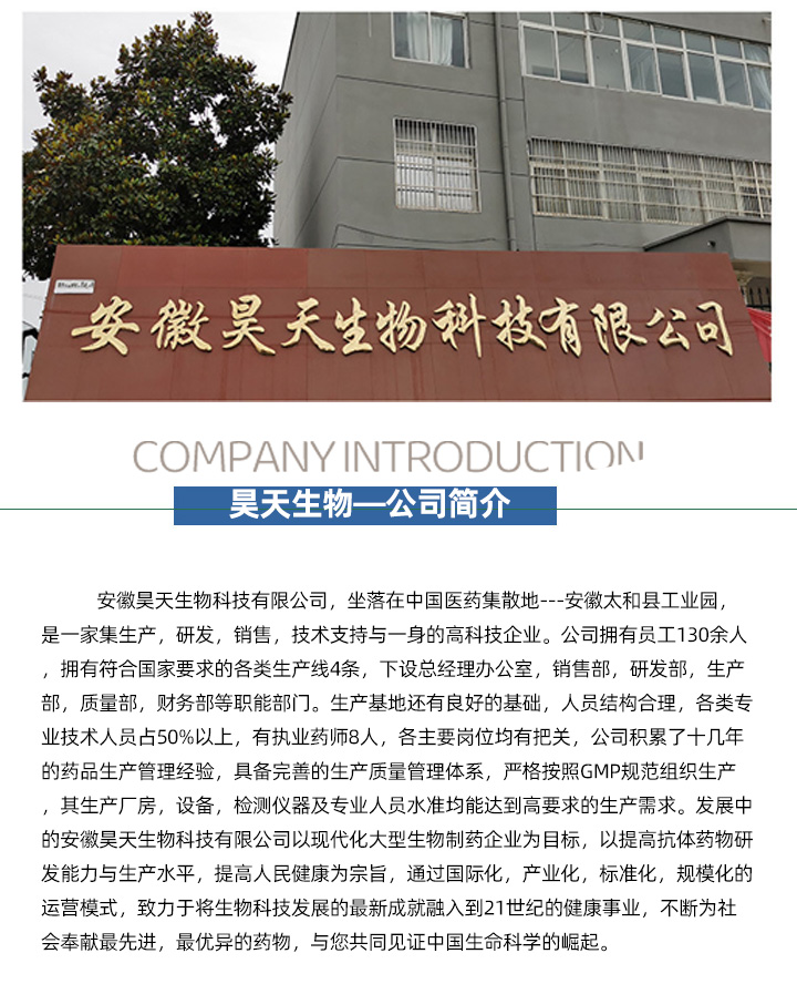 安徽昊天生物科技有限公司,坐落在中國醫藥集散地---安徽太和縣工業園,是一家集生產,研發,銷售,技術支持與一身的高科技企業。公司擁有員工130余人,擁有符合國家要求的各類生產線4條,下設總經理辦公室,銷售部,研發部,生產部,質量部,財務部等職能部門。生產基地還有良好的基礎,人員結構合理,各類專業技術人員占50%以上,有執業藥師8人,各主要崗位均有把關,公司積累了十幾年的藥品生產管理經驗,具備完善的生產質量管理體系,嚴格按照GMP規范組織生產,其生產廠房,設備,檢測儀器及專業人員水準均能達到高要求的生產需求。發展中的安徽昊天生物科技有限公司以現代化大型生物制藥企業為目標,以提高抗體藥物研發能力與生產水平,提高人民健康為宗旨,通過國際化,產業化,標準化,規模化的運營模式,致力于將生物科技發展的最新成就融入到21世紀的健康事業,不斷為社會奉獻最先進,最優異的藥物,與您共同見證中國生命科學的崛起收起。