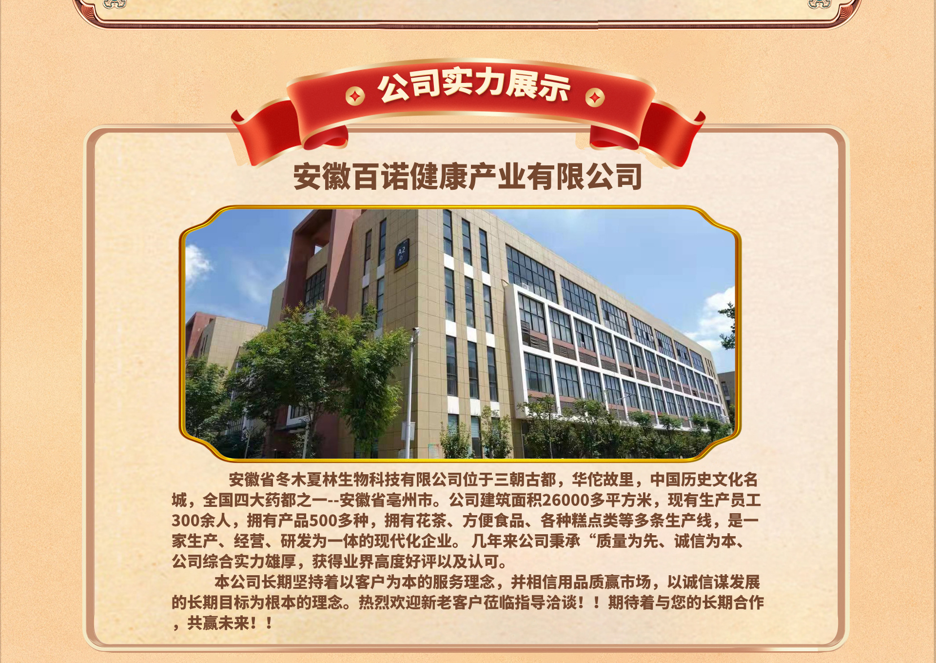 本公司坐落于中國(guó)四大藥都安徽省亳州市十河鎮(zhèn)工業(yè)區(qū).源頭廠家貨源充足.長(zhǎng)期洽談代工互贏互利.主營(yíng)袋泡茶.三角包.組合茶.各種膏子.壓片糖果.凝膠糖果.足浴包等六條生產(chǎn)線.竭誠(chéng)滿足各位顧客的需求