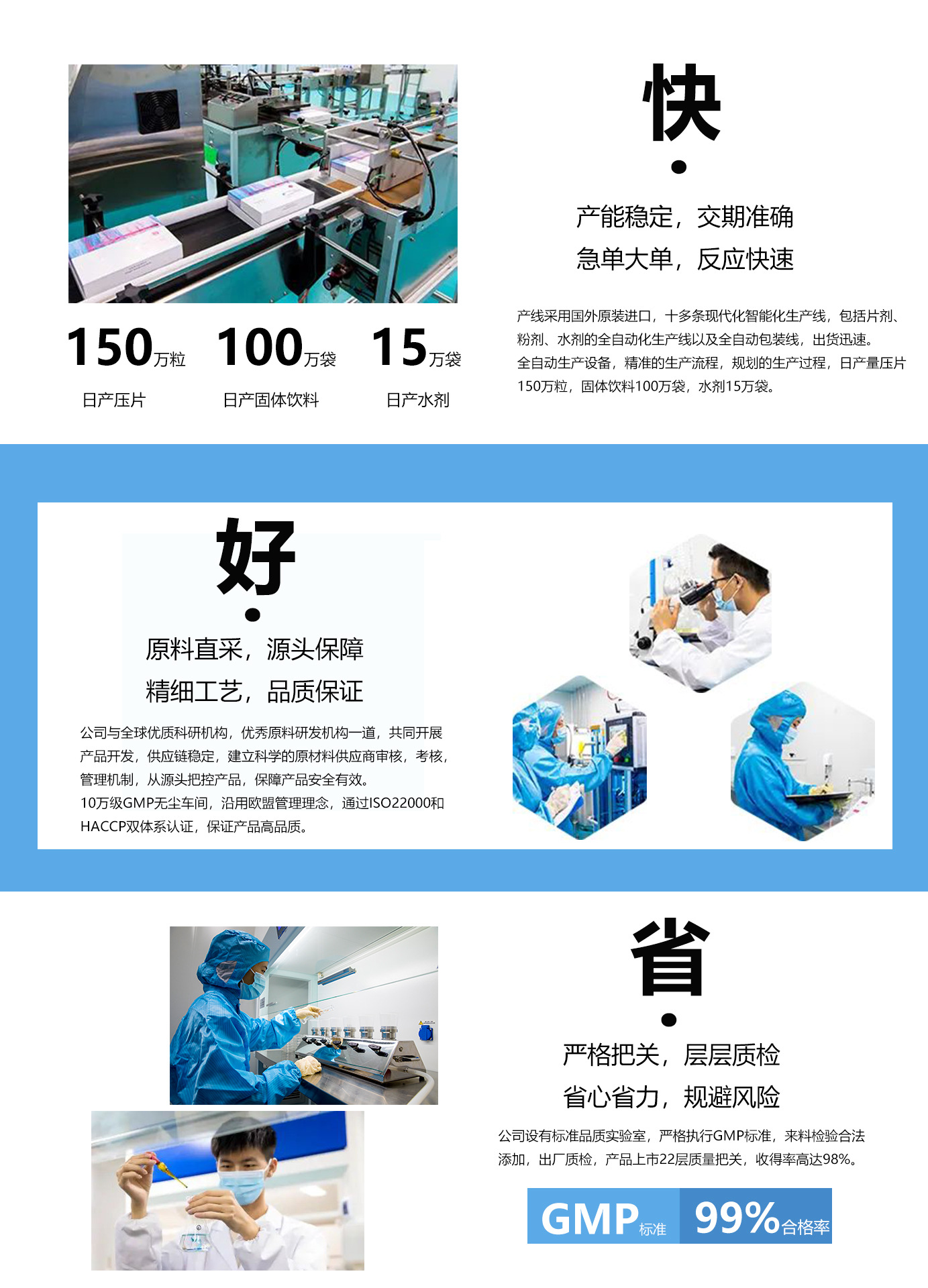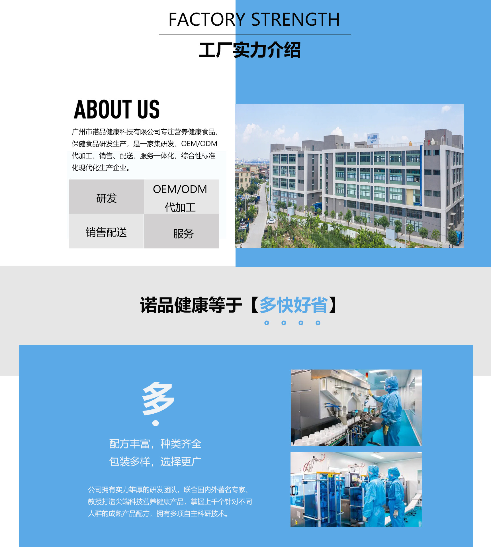 廣州市諾品健康科技有限公司成立于2020年,注冊資金1000萬,是一家營養健康食品,保健食品,時尚食品的標準化現代化生產企業,同時也是全國獨一家可配套倉儲配送的全生態的生產服務型企業。 工廠zh占地面積15000平方米,擁有3個10萬級潔凈車間,總潔凈面積6000平方米,工人150人,以OEM/ODM服務為載體,是一家集研發、生產、銷售、配送一體化,擁有高效、智能、高自動的先進生產線:10億片年產量片劑線;5億條年產量粉劑線;5000萬袋年產量口服液。