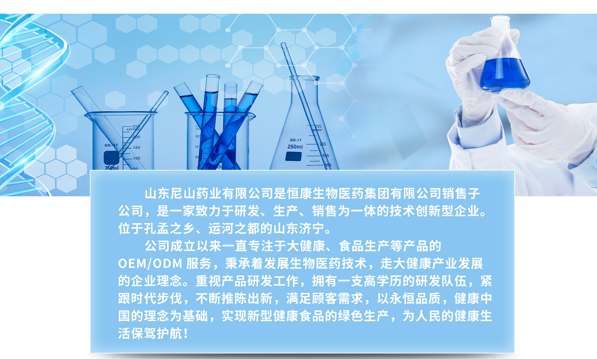 山東尼山藥業有限公司是保健食品、保健食品等產品專業生產加工的公司,擁有完整、科學的質量管理體系。山東尼山藥業有限公司的誠信、實力和產品質量獲得業界的認可。歡迎各界朋友蒞臨參觀、指導和業務洽談。