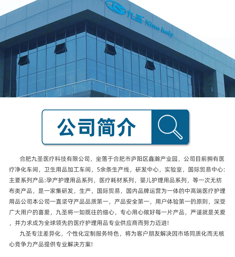 合肥九圣醫療科技有限公司,坐落于合肥市廬陽區鑫瀚產業園,公司目前擁有醫療凈化車間,衛生用品加工車間,5余條生產線,研發中心,實驗室,國際貿易中心:主要系列產品:孕產護理用品系列,醫療耗材系列,嬰兒護理用品系列,等一次無紡布類產品,是一家集研發,生產,國際貿易,國內品牌運營為一體的中高端醫療護理用品公司本公司一直堅守產品品質第一,產品安全第一,用戶體驗第一的原則,深受廣大用戶的喜愛,九圣將一如既往的細心,專心用心做好每一片產品,嚴謹就是關愛,并力求成為全球領先的醫療護理用品專業供應商而努力邁進!