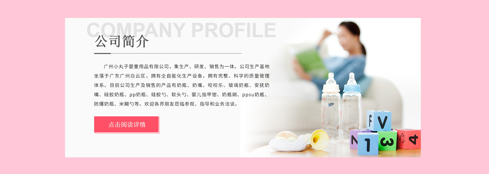 廣州小丸子嬰童用品有限公司是奶瓶、奶嘴、嬰兒用品、兒童餐具、牙膠、玻璃奶瓶、安撫奶嘴、吸奶器、乳墊、奶粉盒、水杯、奶瓶配件、ppsu奶瓶、喂藥器、硅膠奶瓶等等產品專業生產加工的公司,擁有完整、科學的質量管理體系。深圳市龍崗區貝樂母嬰用品廠的誠信、實力和產品質量獲得業界的認可。歡迎各界朋友蒞臨參觀、指導和業務洽談。