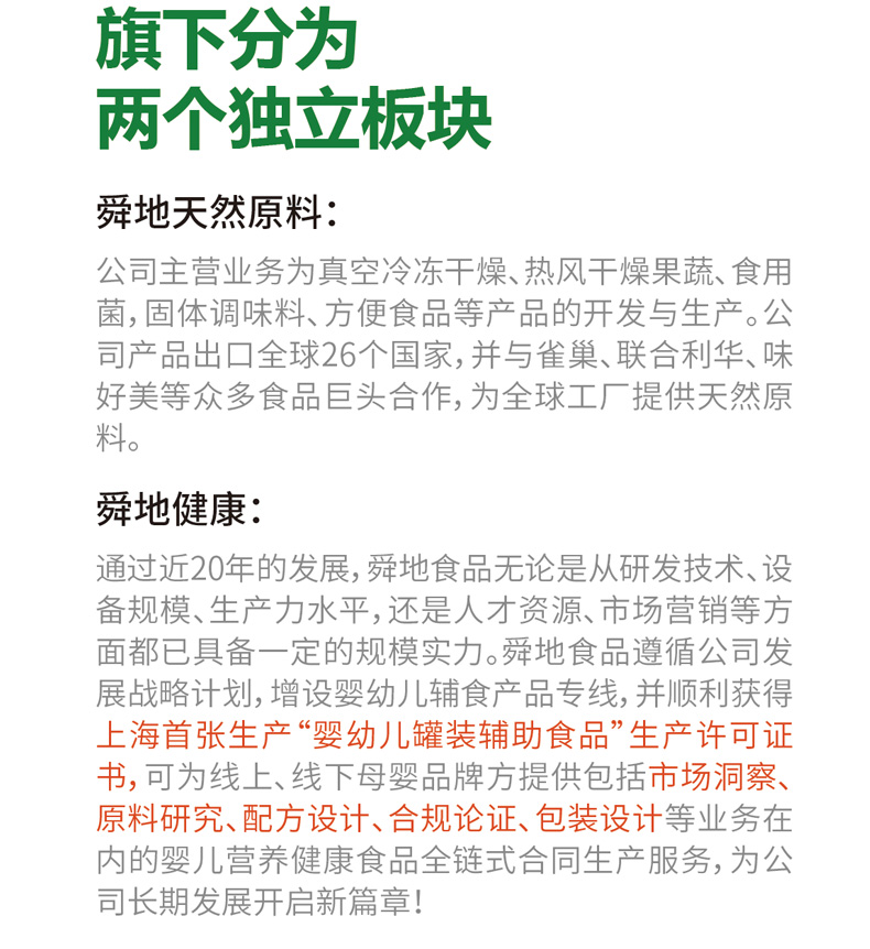 通過近20年的發展,舜地食品無論是從研發技術、設備規模、生產力水平,還是人才資源、市場營銷等方面都已具備一定的規模實力。在2022年,舜地食品遵循公司發展戰略計劃,新增嬰兒輔食類產品專線,并順利獲得上海首張生產嬰兒輔助灌裝輔食資質證書,可為線上、線下母嬰品牌方提供包括市場洞察、原料研究、配方設計、合規論證、包裝設計等業務在內的嬰兒營養健康食品全鏈式合同生產服務,為公司長期發展開啟新篇章!
