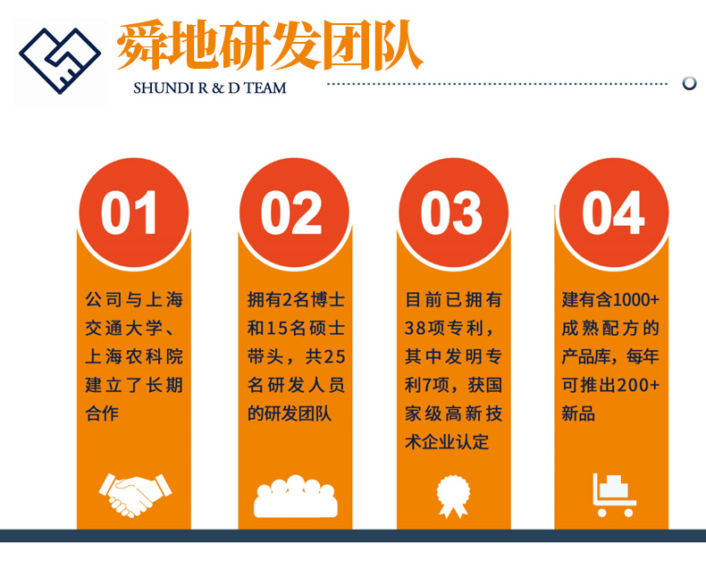 在上海市普陀區設立研發中心,并與上海交通大學、上海農科院建立了長期合作,并擁有2名博士和15名碩士帶頭、共25名研發人員的研發團隊。基于研發上持續地高投入,目前已擁有38項專利,其中發明專利7項,獲國家級高新技術企業認定,建有一個含1000+成熟配方的產品庫,每年可推出200+新品。