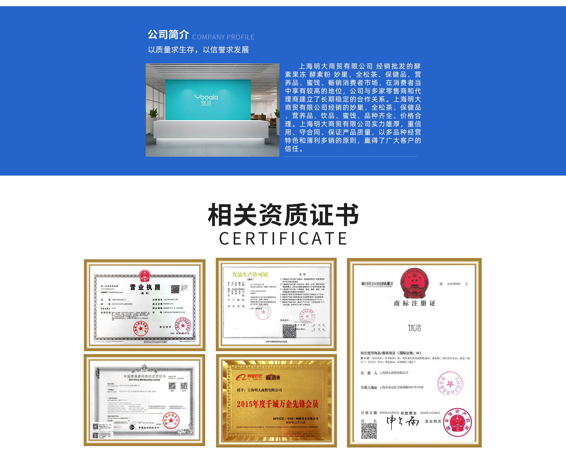 上海明大商貿有限公司 經銷批發的酵素果凍 酵素粉 妙巢、全松茶、保健品、營養品、蜜餞、暢銷消費者市場,在消費者當中享有較高的地位,公司與多家零售商和代理商建立了長期穩定的合作關系。上海明大商貿有限公司經銷的妙巢、全松茶、保健品、營養品、飲品、蜜餞、品種齊全、價格合理。上海明大商貿有限公司實力雄厚,重信用、守合同、保證產品質量,以多品種經營特色和薄利多銷的原則,贏得了廣大客戶的信任。