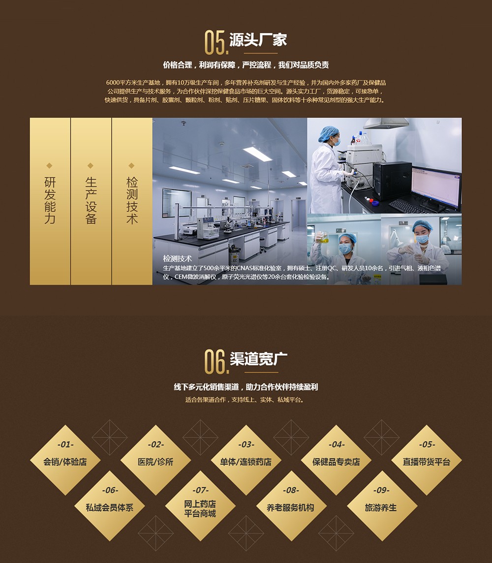 桂仁營養現有20余項保健食品注冊批件,致力于為客戶提供包括市場渠道分析、產品研究與開發、生產與包裝、質量管理以及營銷支持等一站式大健康保健食品智造營銷解決方案服務。并以優質的產品,高品質的服務,助力每一位合作伙伴贏得成功。