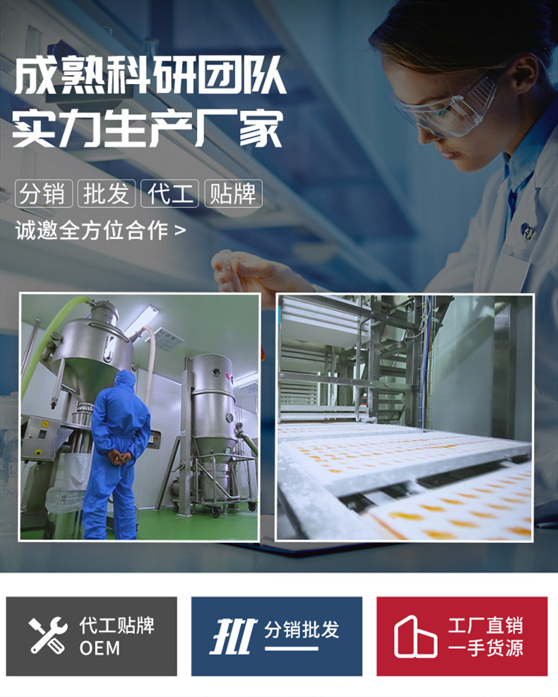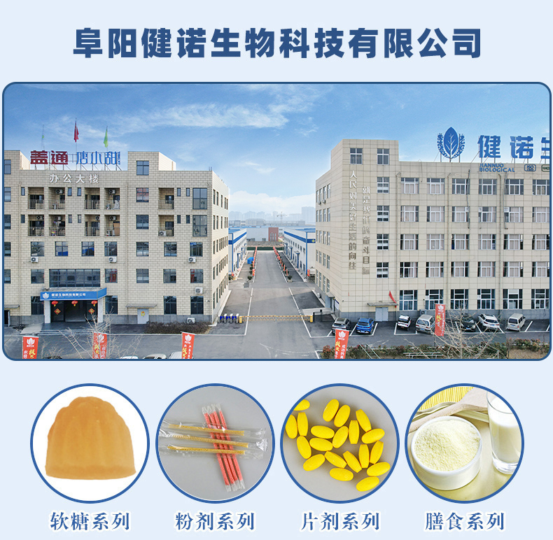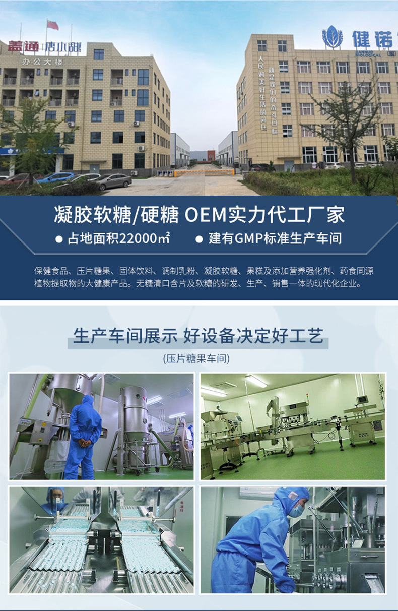 現已形成生物制品、保健食品、大健康食品、無糖清口含片及軟糖的研發、生產、銷售一體的現代化企業。此外,也專注于軟糖、壓片糖果、產品代加工、OEM/ODM一站式定制服務。目前已為三只松鼠、良品鋪子、君樂寶、瑞龍國藥、燕之坊、叮當健康等代工。