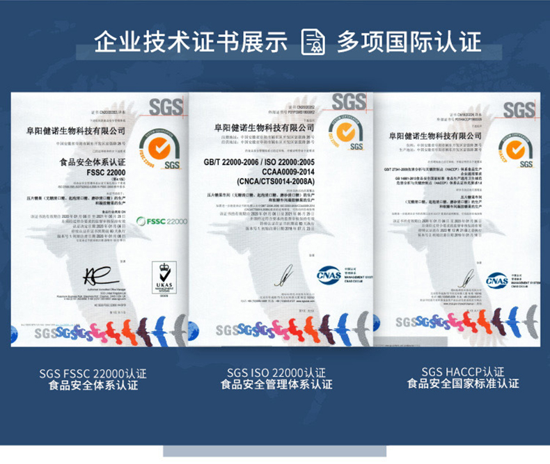 合肥健諾生物科技于2014年1月在安徽省阜陽市投資成立阜陽健諾生物科技有限公司,公司占地面積22000余平方米,建有保健食品GMP、食品SC生產車間。先后通FSSC22000、ISO22000和HACCP認證。2021年6月拿到全國第一張軟糖保健食品批文。
