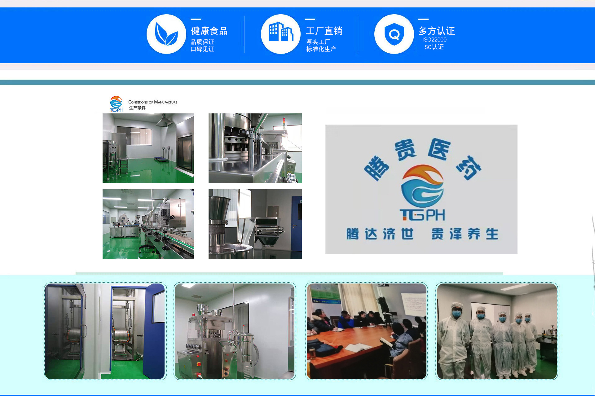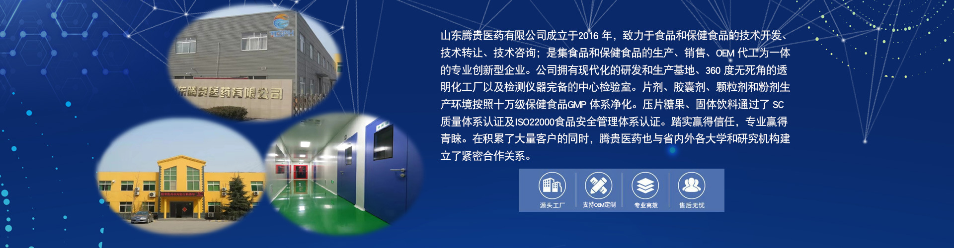 山東騰貴醫藥有限公司成立于2016 年,致力于食品和保健食品的技術開發、技術轉讓、技術咨詢;是集食品和保健食品的生產、銷售、OEM 代工為一體的專業創新型企業。公司擁有現代化的研發和生產基地、360 度無死角的透明化工廠以及檢測儀器完備的中心檢驗室。片劑、膠囊劑、顆粒劑和粉劑生產環境按照十萬級保健食品 GMP 體系凈化。壓片糖果、固體飲料通過了 SC 質量體系認證及ISO22000食品安全管理體系認證。踏實贏得信任,專業贏得青睞。在積累了大量客戶的同時,騰貴醫藥也與省內外各大學和研究機構建立了緊密合作關系。