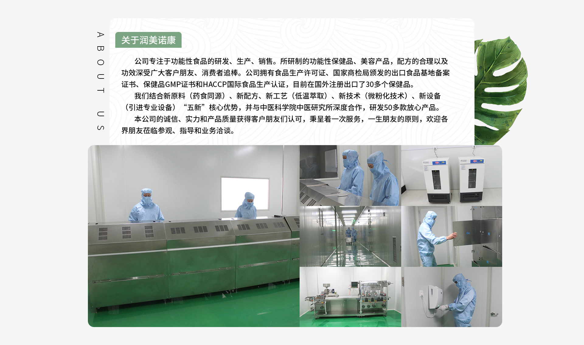 公司專注于功能性食品的研發、生產、銷售。所研制的功能性保健品、美容產品,配方合理、功效顯著深受廣大客戶朋友、消費者追棒。 公司擁有食品生產許可證、國家商檢局頒發的出口食品基地備案證書、保健品GMP證書和HACCP國際食品生產認證,目前在國外注冊出口了30多個保健品。 我們結合新原料(藥食同源)、新配方(復方獨家配伍)、新工藝(低溫萃取)、新技術(微粉化技術)、新設備(進口高端設備)“五新”核心優勢,并與中醫科學院中醫研究所深度合作,研發50多款健康產品