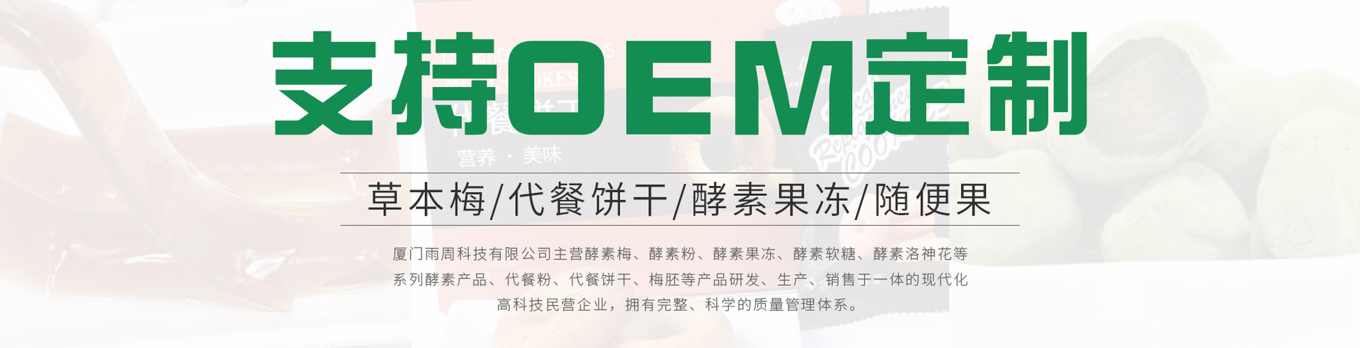 廈門雨周科技有限公司,致力為全球客戶提供天然、綠色、健康的功能性食品,是酵素梅、酵素粉、酵素果凍、酵素軟糖、酵素洛神花等系列酵素產品、代餐粉、代餐餅干、梅胚等產品研發、生產、銷售于一體的現代化高科技民營企業,擁有完整、科學的質量管理體系。廈門雨周科技有限公司工作環境優雅,生產設備先進,公司的誠信、實力和產品質量獲得業界的認可。歡迎各界朋友蒞臨參觀、指導和業務洽談。