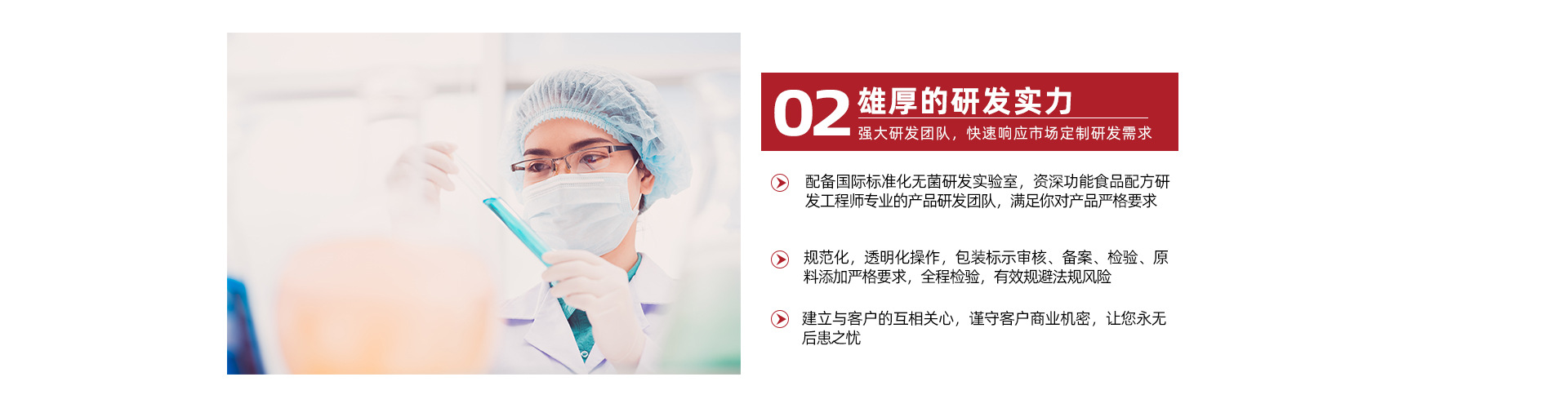 公司擁有一支精干、高效、專業、年輕的研發、生產、管理團隊,規模化的生產量與高標準的GMP、SC品控管理,確保所有產品全部使用電子監管碼,讓每個產品都能接受監管部門及生產企業的追溯和管理,更好的維護產品生產商及消費者的合法權益,為消費者提供專業、安全、高效、適價的科技健康食品。