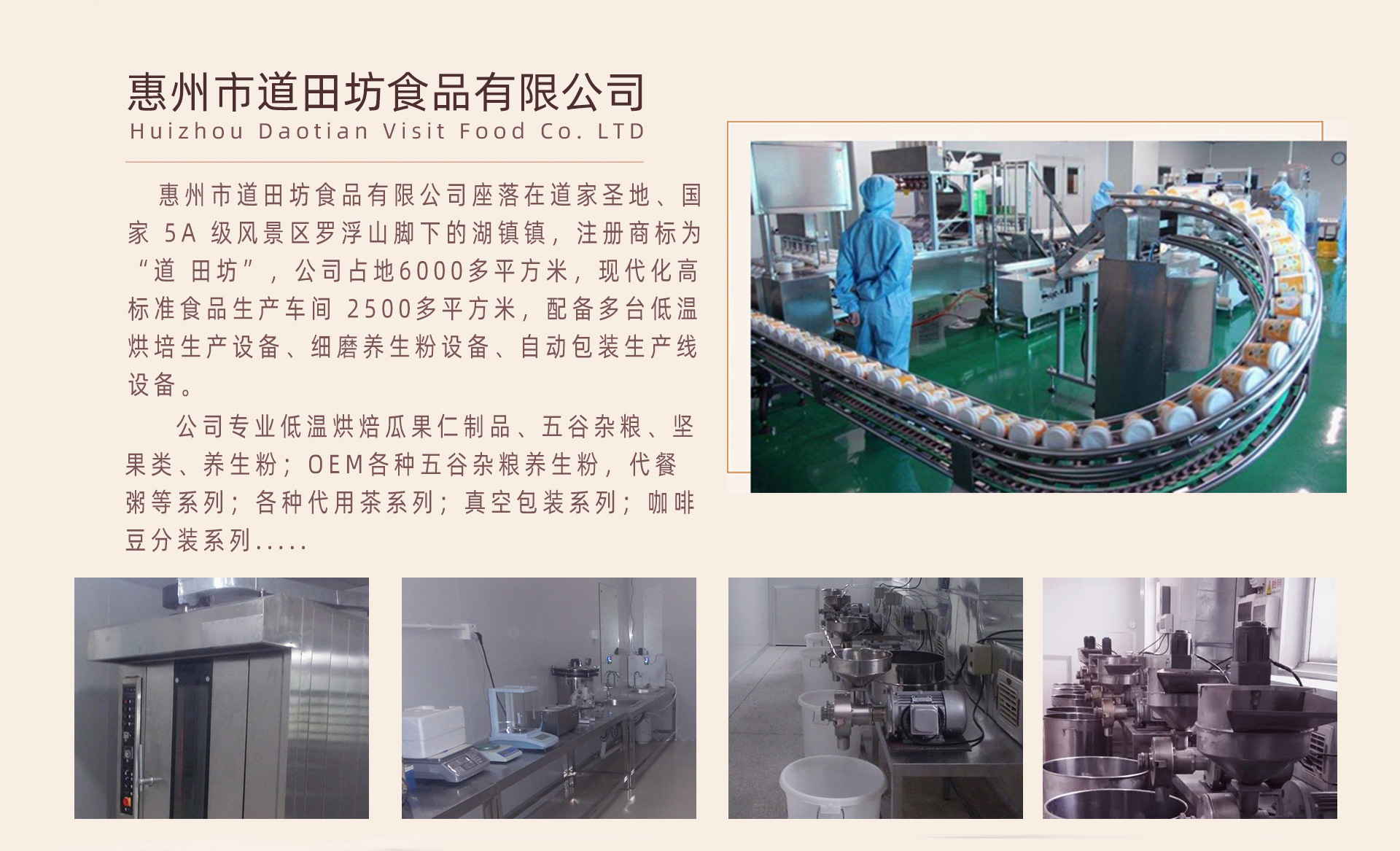 惠州市道田坊食品有限公司座落在道家圣地、國(guó)家5A級(jí)風(fēng)景區(qū)羅浮山腳下的湖鎮(zhèn)鎮(zhèn),注冊(cè)商標(biāo)為“道田坊”,公司占地6000多平方米,現(xiàn)代化高標(biāo)準(zhǔn)食品生產(chǎn)車間2500多平方米,配備國(guó)內(nèi)先進(jìn)低溫烘培生產(chǎn)設(shè)備、細(xì)磨養(yǎng)生粉設(shè)備、自動(dòng)包裝生產(chǎn)線設(shè)備。公司專業(yè)低溫烘焙瓜果仁制品、五谷雜糧、堅(jiān)果類、養(yǎng)生粉、五谷代餐粥系列產(chǎn)品,水果干制品系列產(chǎn)品,咖啡豆分裝系列,真空五谷雜糧、五谷八寶粥、五谷十寶米系列產(chǎn)品。公司擁有國(guó)內(nèi)領(lǐng)先低溫烘焙技術(shù)及生產(chǎn)加工設(shè)備,所有原材料的采購(gòu)均與產(chǎn)地掛鉤收購(gòu),并進(jìn)行原材料檢測(cè)、挑選、清洗、低溫烘培、冷卻、細(xì)磨、成品檢驗(yàn)、包裝規(guī)范生產(chǎn)流程,不添加任何添加劑防腐劑,嚴(yán)格遵從國(guó)家食品安全生產(chǎn)許可標(biāo)準(zhǔn)生產(chǎn),做到每個(gè)生產(chǎn)環(huán)節(jié)嚴(yán)格把控,確保產(chǎn)品安全及營(yíng)養(yǎng)的保留。 “健康無(wú)價(jià),養(yǎng)生有道。”羅浮山作為養(yǎng)生圣地,以其豐富的植物資源、珍貴的水資源和空氣資源享譽(yù)海內(nèi)外。