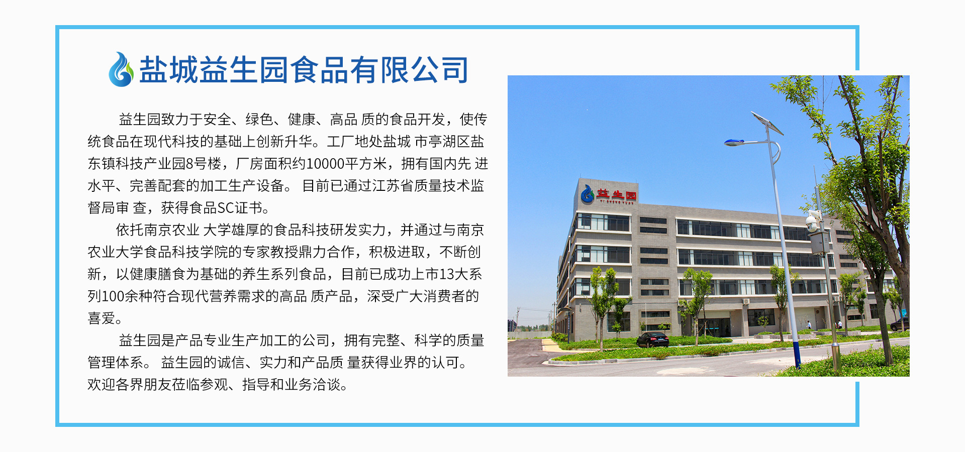 益生園是南農食品全資控股,集設計、研發、加工、生產、物流于一身的專業代加工OEM子品牌。 總部設在南京,工廠地處鹽城市亭湖區鹽東鎮科技產業園8號樓,廠房面積約10000平方米,擁有國內先進水平、完善配套的加工生產設備。 目前已通過江蘇省質量技術監督局審查,獲得食品SC證書。 益生園致力于安全、綠色、健康、高品質的食品開發,使傳統食品在現代科技的基礎上創新升華。 依托南京農業大學雄厚的食品科技研發實力,并通過與南京農業大學食品科技學院的專家教授鼎力合作,積極進取,不斷創新,以健康膳食為基礎的“南農五谷粉”系列食品,目前已成功上市13大系列100余種符合現代營養需求的高品質產品,深受廣大消費者的喜愛。 益生園是產品專業生產加工的公司,擁有完整、科學的質量管理體系。 益生園的誠信、實力和產品質量獲得業界的認可。 歡迎各界朋友蒞臨參觀、指導和業務洽談。