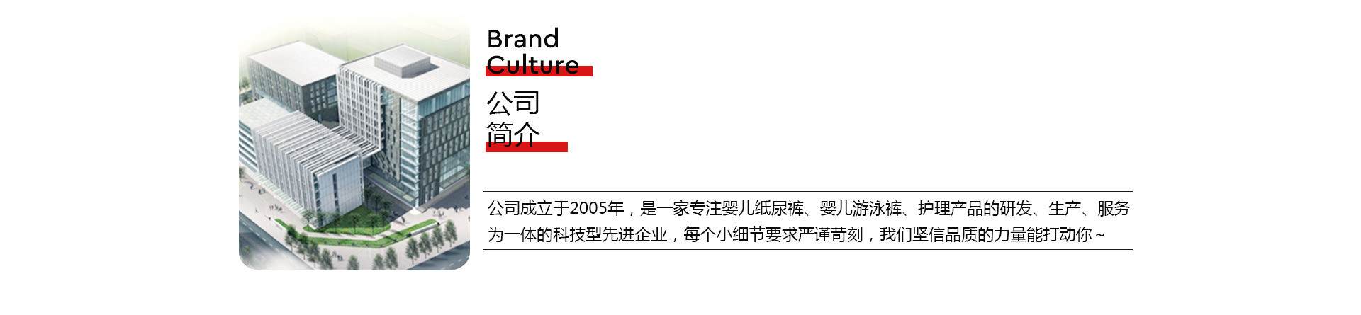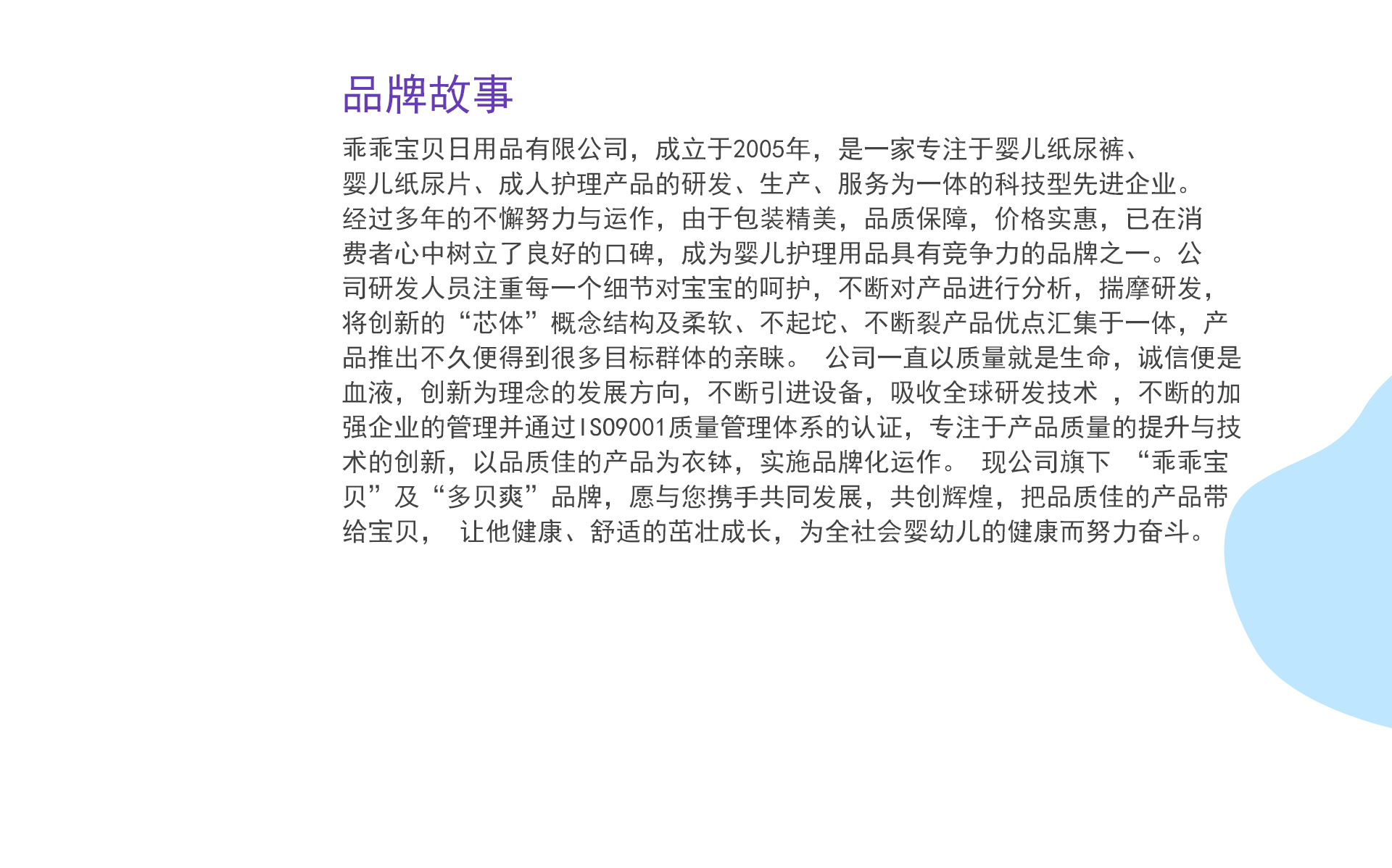 乖乖寶貝日用品有限公司,成立于2005年,是一家專注于嬰兒紙尿褲、嬰兒紙尿片、成人護理產品的研發、生產、服務為一體的科技型先進企業。 經過多年的不懈努力與運作,由于包裝精美,品質保證,價格實惠,已在消費者心中樹立了良好的口碑,成為嬰兒護理用品最具競爭力的品牌之一。公司研發人員注重每一個細節對寶寶的呵護,不斷對產品進行分析,揣摩研發,將創新的“芯體”概念結構及超柔軟、超透氣、不起坨、不斷裂產品優點匯集于一體,產品推出不久便得 到眾多目標群體的親睞。 公司一直以質量就是生命,誠信便是血液,創新為理念的發展方向,不斷引進高端設備,吸收國際研發技術 ,不斷的加強企業的管理并通過ISO9001質量管理體系的認證,專注于產品質量的提升與技術的創新,以高品質 的產品為衣缽,實施品牌化運作。 現公司旗下 “乖乖寶貝”及“多貝爽”品牌,愿與您攜手共同發展,共創輝煌,把高品質的產品帶給億萬寶寶, 讓他健康、舒適的茁壯成長,為全社會億萬嬰幼兒的健康而努力奮斗。