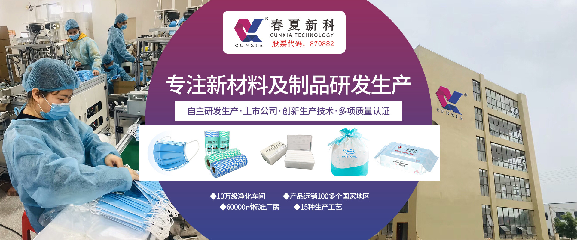 廣東春夏新材料科技股份有限公司是一家研發、生產、銷售無紡新材料及無紡制品為一體的上市公司。股票代碼:870882。并獲得國家高新技術企業證書,廠房占地面積約60000平方米。新材料研發有熱風、熱軋、濕法全棉、紡粘、針刺、水刺、浸漬、網膜、水溶等9種新工藝技術無紡布,配備15種不同工藝制品的生產車間。 產品廣泛用于生活日用品、美容酒店護理、醫療、環保過濾、汽車內飾、衛生防護、工業清潔等一次性用品。公司產品已通過國際最高OEKO-TEX認證和ISO9001質量體系認證及ISO14001環境體系認證,產品遠銷歐美、中東、東南亞、南美等100多個國家。