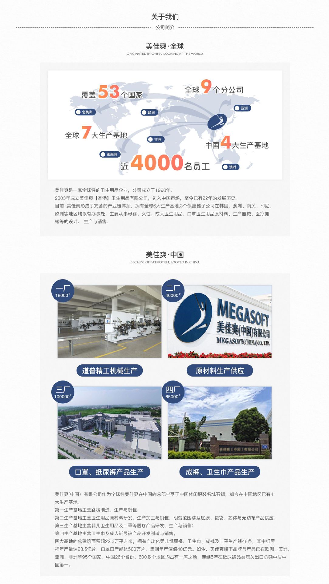 泉州智行天下科技有限公司是由菲律賓MEGASOFT HYGIENIC PRODUCTS INC.獨資創辦的外資公司,是一家集研發、生產和銷售嬰兒紙尿褲、衛生巾、衛生護墊等生活衛生用品的外資企業,注冊資本1000萬元港幣,投資總額為1.2億元人民幣。2012年12月,美佳爽(福建)蛻蛹成蝶,美佳爽(中國)有限公司正式成立。