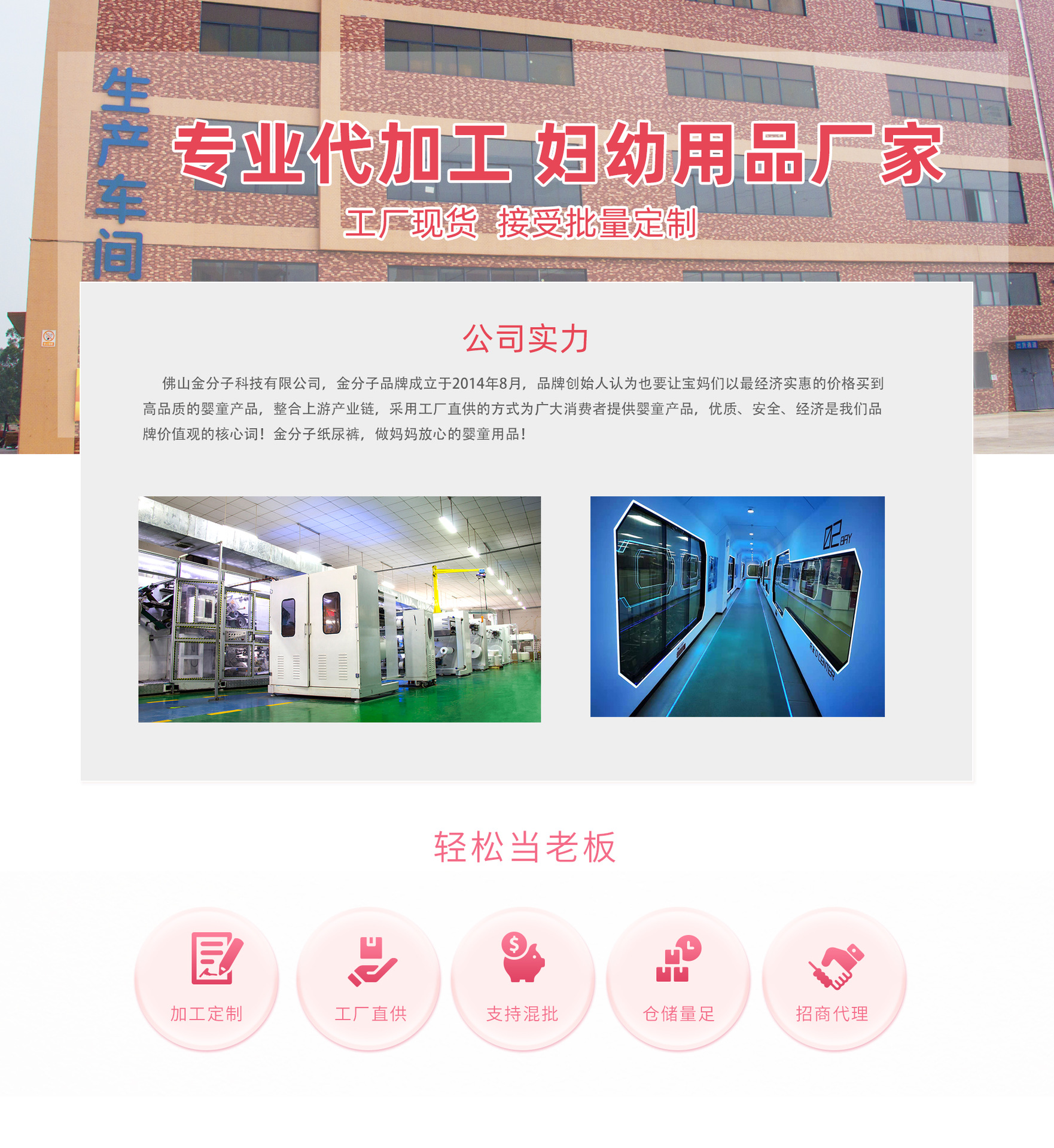 佛山歐品佳衛生用品有限公司,是一家研發和生產紙尿褲的行業 展望未來,歐品佳公司將繼續堅持"以人為本"的企業精神,堅持 "做好為市場著想、為產品服務"的客戶理念,塑造企業文化、吸引更多有經驗的人才,緊貼市場,加大研發投入,著力開發更多好品質的產品,提升我們的服務,將以積極、健康、向上的心態,將企業做大、做強、做精,實現""的企業目標,成就"歐品佳"品牌的!本公司是歐品佳哺育科技旗下的電商公司,公司以紙尿褲研發、定制、批發、網絡銷售等業務為主,2014年9月份推出的金分子系列紙尿褲,品質,經濟實惠的價格,良好的客戶體驗,贏得了市場的一致好評,淘寶網店月銷量達到200萬片以上,歡迎各位新老客戶前來接洽合作!