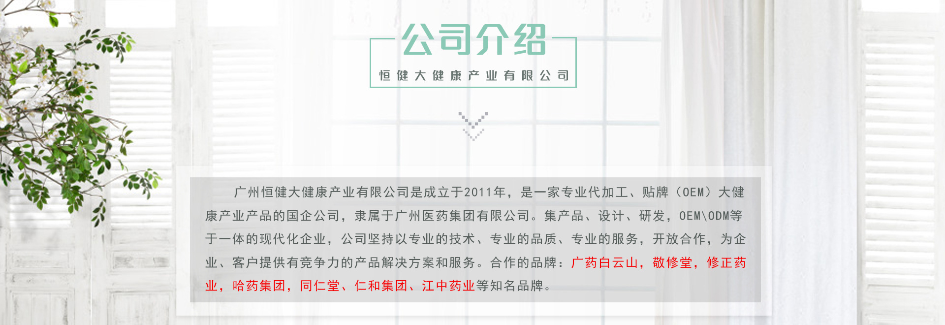 廣州恒健大健康產(chǎn)業(yè)有限公司是成立于2011年,是一家專業(yè)代加工、貼牌(OEM)大健康產(chǎn)業(yè)產(chǎn)品的國企公司,隸屬于廣州醫(yī)藥集團(tuán)有限公司。集產(chǎn)品、設(shè)計(jì)、研發(fā),OEM\ODM等于一體的現(xiàn)代化企業(yè),公司堅(jiān)持以專業(yè)的技術(shù)、專業(yè)的品質(zhì)、專業(yè)的服務(wù),開放合作,為企業(yè)、客戶提供有競爭力的產(chǎn)品解決方案和服務(wù)。合作的品牌:廣藥白云山,敬修堂,修正藥業(yè),哈藥集團(tuán),同仁堂、仁和集團(tuán)、江中藥業(yè)等知名品牌。