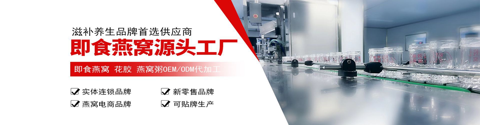 中印生物科技有限公司注冊資金1000萬美金,主營業務:貨物進出口,燕窩生產加工、生物科技研發生產等。車間建立三條全自動燕窩生產線,生產能力涵蓋各種瓶型和各種不同工藝的燕窩加工,日產量1萬瓶以上。公司秉承 ‘安全是基石,質量是企業的生命線’ 的宗旨。公司建立十萬級GMP無菌車間,堅持以制藥的標準做燕窩的原則,為客戶提供品質可靠、營養美味的燕窩產品。