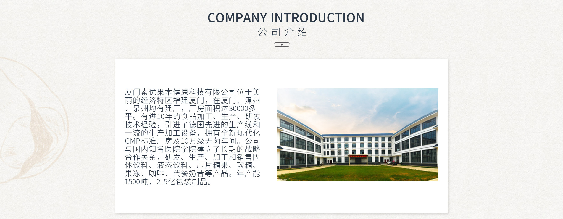 廈門素優果本健康科技有限公司位于美麗的經濟特區福建廈門,在廈門、漳州、泉州均有建廠,廠房面積達30000多平。有進10年的食品加工、生產、研發技術經驗,引進了德國先進的生產線和一流的生產加工設備,擁有全新現代化GMP標準廠房及10萬級無菌車間。公司與國內知名醫院學院建立了長期的戰略合作關系,研發、生產、加工和銷售固體飲料、液態飲料、壓片糖果、軟糖、果凍、咖啡、代餐奶昔等產品。年產能1500噸,2.5億包袋制品。