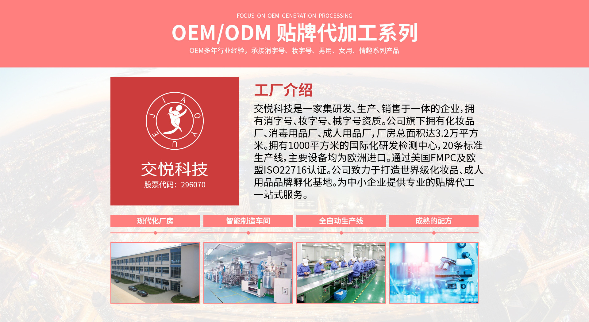 交悅成人用品(廣州)有限公司是集研發、生產、銷售于一體的企業,工廠面積5000平方米,10萬級無塵車間,高級工程師3人、工程師8人,工人200余名,目前擁有5條全自動生產線,15臺乳化攪拌設備,其他各類灌裝等設備50余臺。日生產各類產品10萬套。