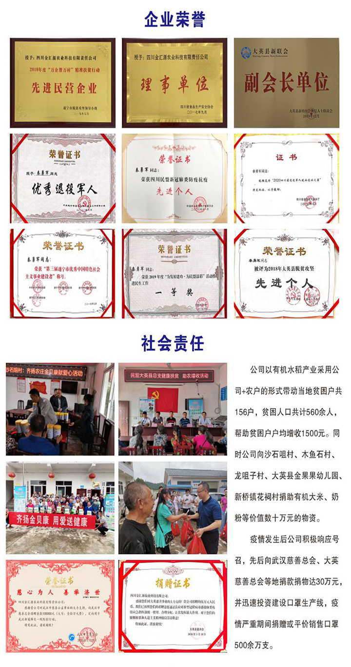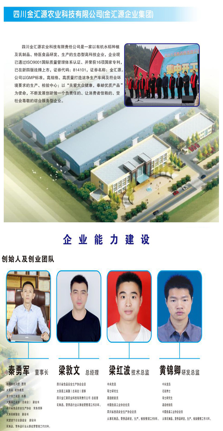 四川金匯源農(nóng)業(yè)科技有限責任公司是一家以有機水稻種植及乳制品、特醫(yī)食品研發(fā)、生產(chǎn)的生態(tài)型高科技企業(yè),企業(yè)現(xiàn)已通過ISO9001國際質(zhì)量管理體系認證、并榮獲16項國家專利,已在新四版掛牌上市,證券代碼:814101,證券名稱:金匯源。公司以GMP標準,高規(guī)格、高質(zhì)量打造潔凈生產(chǎn)車間及符合環(huán)境要求的生產(chǎn)、檢驗中心;以“關(guān)愛大眾健康,奉獻優(yōu)質(zhì)產(chǎn)品”為使命,不斷發(fā)展創(chuàng)新做一個負責任的、讓消費者信賴的、受社會尊敬的綜合服務(wù)型企業(yè)。