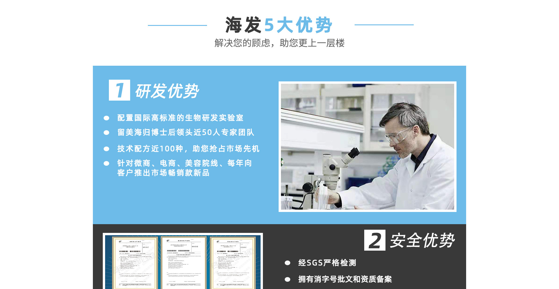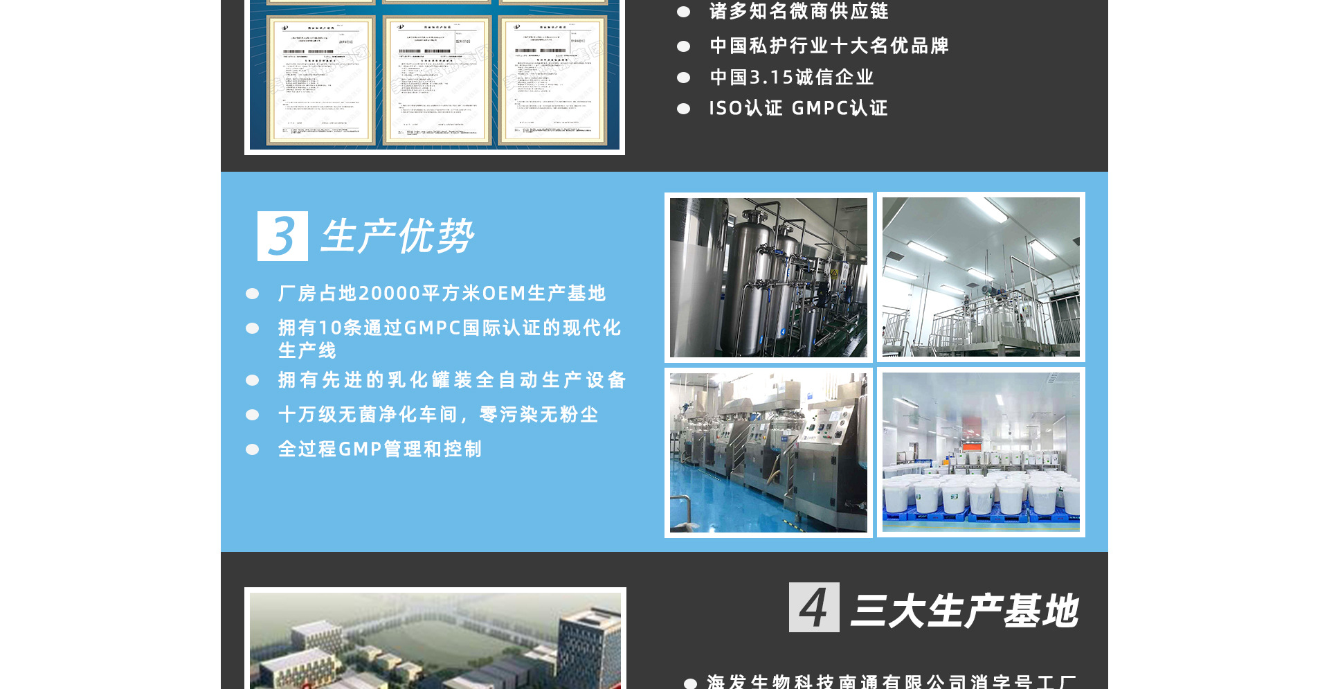 海發生物科技南通有限公司(簡稱海發科技)成立于2016年8月,位于南通中南高科產業園,企業系上海青浦海發公司遷址,占地面積約20000平方米,廠房面積約 1000 平方米,現有員工100 名,管理人員15名,技術研發人員 25 名,現有生產線 10 條,主要產品有私護凝膠\抑菌泡沫洗液\抑菌噴劑\干細胞凝膠\婦科凍干粉\洗潔精\洗手液\消毒劑\工業清洗劑等一百多種,每年日化產能30萬噸,私密護理產品、消毒產品產能有保障.消毒產品出口美國,澳大利亞,意大利,德國以及東南亞地區.企業嚴格遵循體系管理要求,開展企業管理,通過了ISO9001質量體系認證,2019年獲得中國國際電子商務中心頒發誠<信示范經營認證>. 熱誠歡迎各渠道客戶來選品:微商、電商、直銷、直播、美容院線、社區團購、實體等前來洽談合作,OEM/ODM貼牌代加工,品牌賦能,一站式服務。