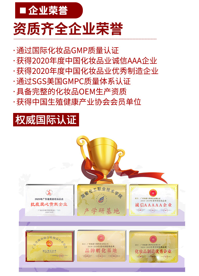 廣州賽薇生物科技有限公司是一家專業從事化妝品研究、生產、加工貼牌的生產企業,面積達近20000方,擁有妝字號,消字號,械字號,粉單元等國際化標準的10萬級生產車間,同時獲得SGS公司美國G M PC和ISO歐盟雙認證,全自動化流水生產線18條,近500平方的國際先進的實驗室及20多人的工程師研發團隊。與英國分子與生物科學研究中心、廣州藥科大學藥學院、湖南化工學院等多所國內外科研機構和大學進行技術交流與緊密合作,以其資源及研發能力和優勢,打造化妝品及大健康行業的OE M/O DM供應鏈源頭廠家。