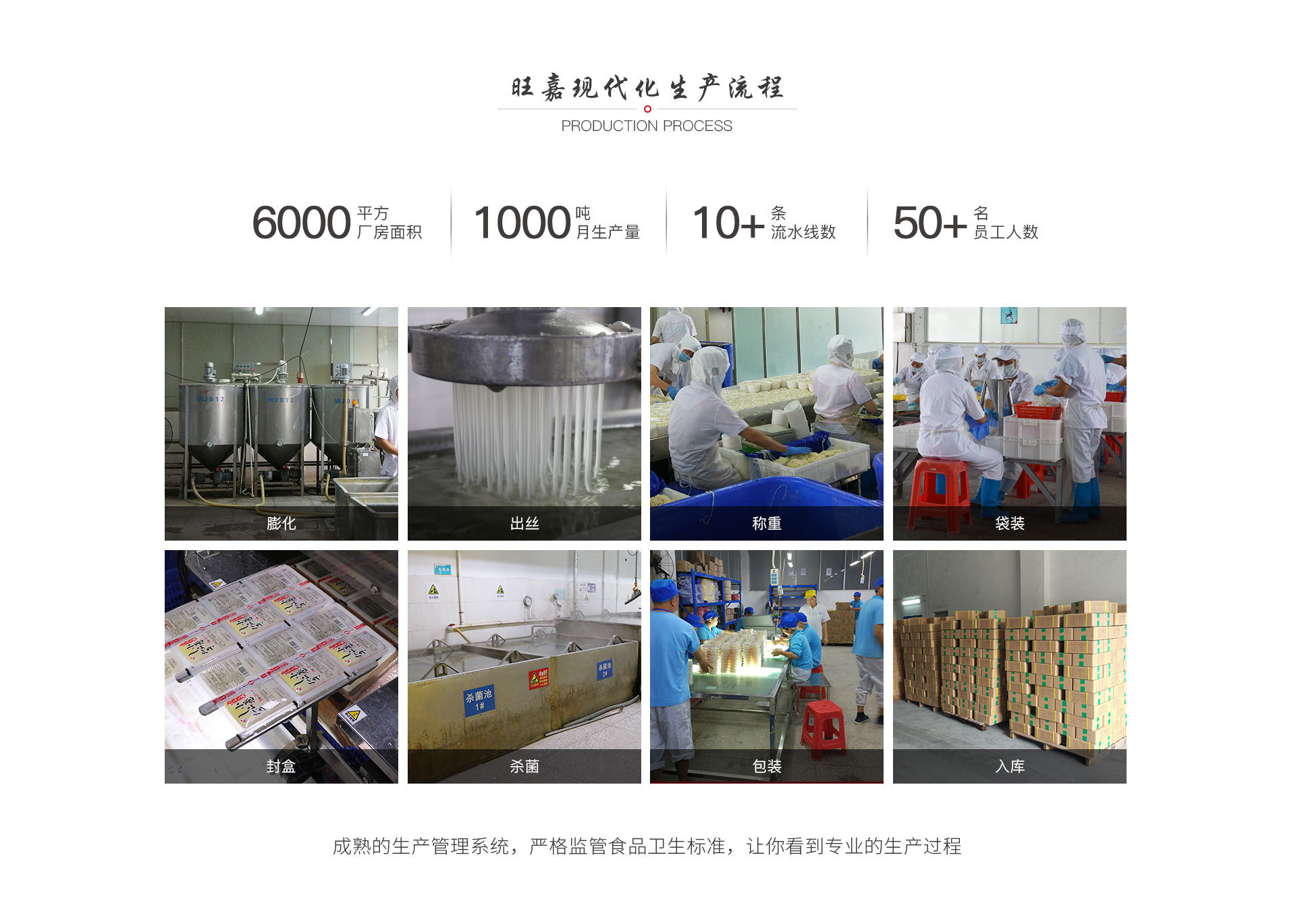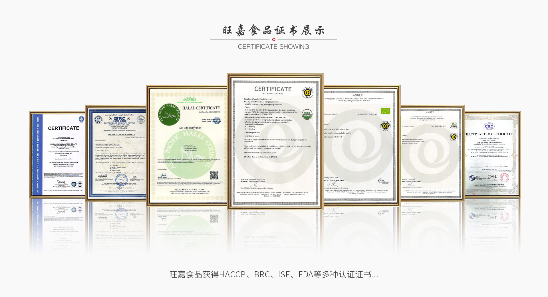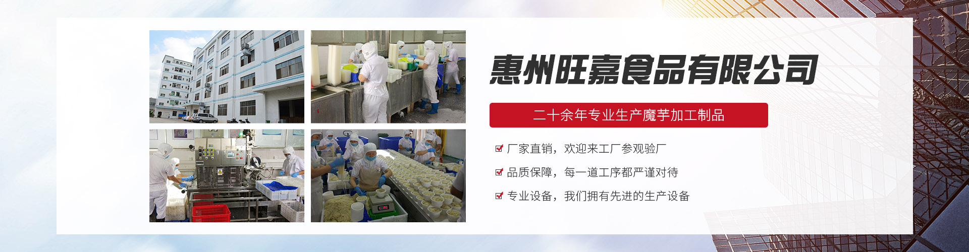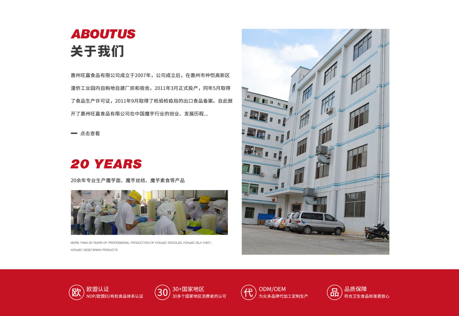 惠州旺嘉食品有限公司成立于2007年,公司成立后,在惠州市仲愷高新區潼僑工業園內自購地自建廠房和宿舍。2011年3月正式投產,同年5月取得了食品生產許可證,2011年9月取得了檢驗檢疫局的出口食品備案。自此掀開了惠州旺嘉食品有限公司在中國魔芋行業的創業、發展歷程。 惠州旺嘉食品有限公司自投產以來,積極引進先進的管理經驗,管理人才,和國外的先進設備。經過不懈努力,公司先后通過了國內外多家認證機構的認證,他們是: HACCP國際食品安全體系認證;BRC國際食品安全體系認證;IFS國際食品安全體系認證;美國NOP\歐盟EU\日本JAS等有機食品體系認證;美國FDA備案企業;SA8000社會責任管理體系認證;Halal和Kosher潔食認證。惠州旺嘉食品有限公司生產的魔芋面系列,魔芋米系列,魔芋絲結系列,魔芋素食系列,魔芋調味系列產品暢銷國內外,得到了國內外近40個國家和地區消費者的認可和好評!