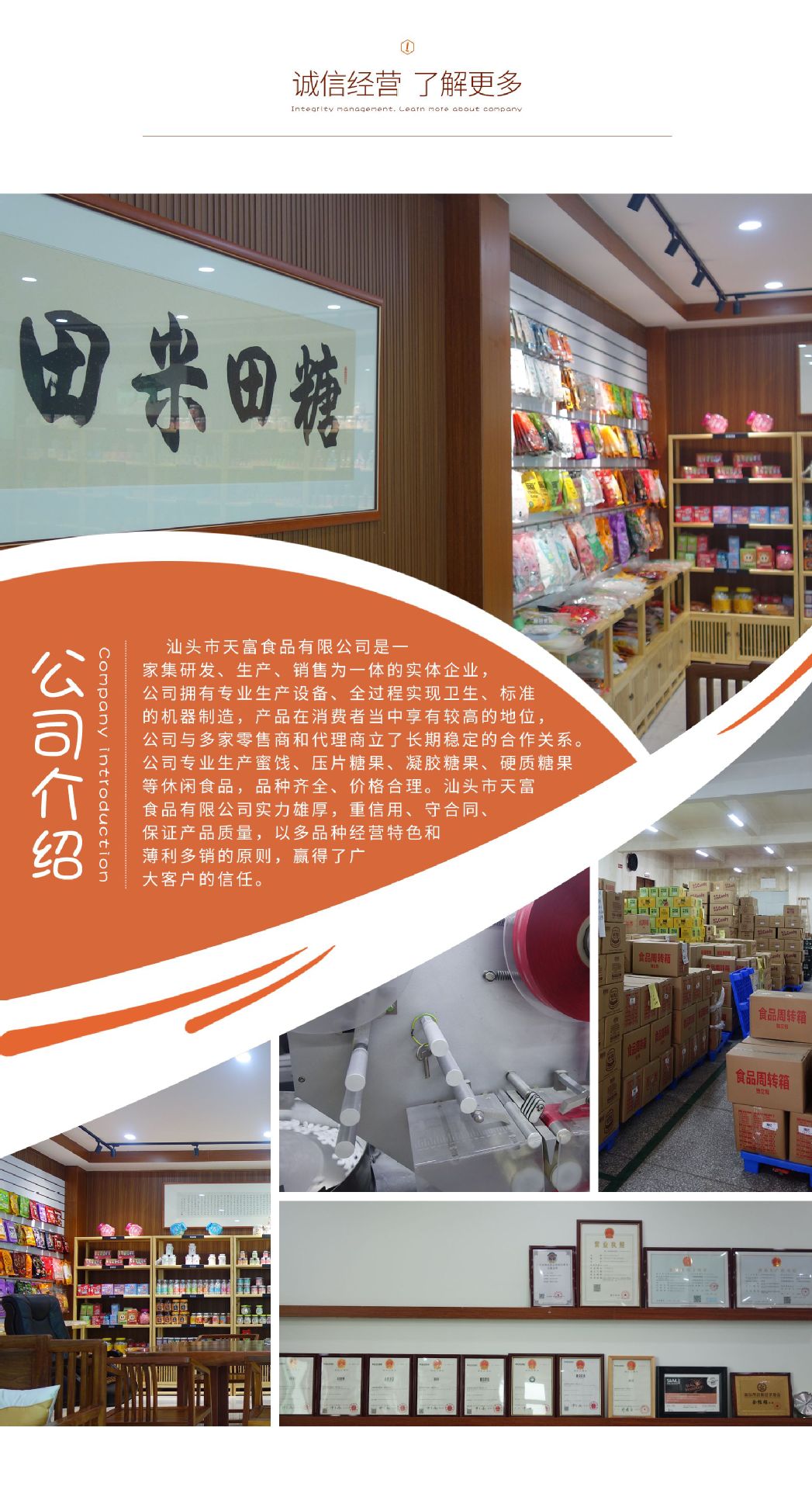 汕頭市天富食品有限公司座落在氣候宜人的海濱城市-汕頭市。公司自 2012年開始致力于中國市場,現有的產品系列涵蓋無糖薄荷壓片糖、奶片 壓片糖、果味硬糖、棉花糖和休閑小食等。 我司主營內銷及出口,在“ ” 的品牌戰略 指導下,營銷網絡已遍及經濟發達的沿海地區和部分內陸省份,銷售我們公 司產品的零售點超過千家。 目前我們已經和山姆、吉之島、易初蓮花、永輝等大型零售企業合作, 取得了理想的經營業績,真正達到了供應商、零售商、消費者三贏的目 標。 我們一直倡導“誠信、務實、時尚、創新”的經營理念,信守“平等互利” 的經營宗旨,發揮團隊協作精神,努力為廣大客戶提供更多具有核心競爭力 和生命力的產品,打造更加開放性的合作平臺,共圖發展,攜手創造美好的 未來。