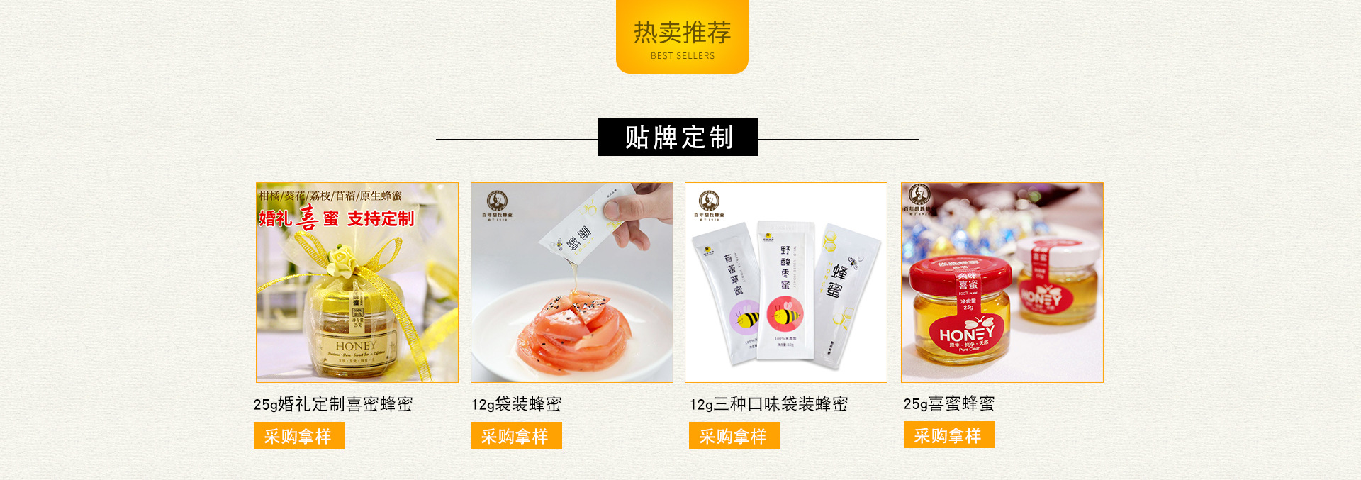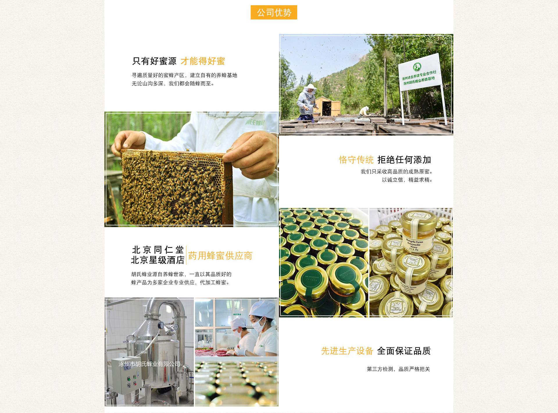 涿州市胡氏蜂業有限公司毗鄰北京,源自養蜂世家,由我國養蜂先驅胡述古先生創立于1920年,已有百年歷史,憑借四代傳承的養蜂取蜜技藝入選非物質文化遺產保護單位,并被評選為“燕趙老字號品牌”。胡氏蜂業不僅是農業產業化龍頭企業,并且擁有專屬養蜂合作社,并被評為農業專業合作社示范社。 作為專業高品質蜂蜜供應商,胡氏蜂業一直恪守傳統、拒絕添加,堅持采收高濃度的成熟原蜜,并創新低溫過濾工藝,使其蜂蜜具有更多活性營養和濃郁花香,品質出眾。胡氏蜂業創新推出的婚禮蜂蜜帶動了國內喜蜜流行風潮,并被CCTV、BTV、《新娘雜志》等眾多媒體報道推薦。 胡氏蜂業產品規格、品類豐富,擁有自主品牌和直營專賣店,并為經銷商提供批發、代發、定制合作,同時為眾多知名廠商和品牌提供原料蜂蜜及OEM代加工服務,并得到合作伙伴一致信賴。胡氏蜂業愿與社會各界攜手共進,打造百年優質品牌!歡迎來電咨詢、入廠參觀,洽談合作!